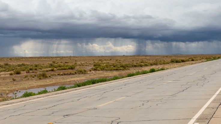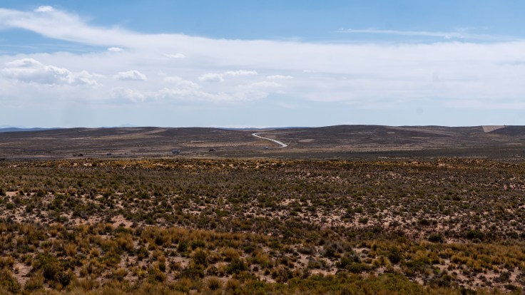 C’est dans ce décor qu’un bruit métallique que nous connaissons retentit: un rayon arrière a cédé sur le Panzer. L’occasion de s’arrêter pour le pique-nique sur quelques cailloux gris parmi ce rouge flamboyant. Mais pas au-delà. Sylvain essaye de rouler sur la terre: erreur ! La roue avant s’enfonce et colle au sol, comme ses baskets qui ont une double semelle maintenant. Marche arrière, nous n’irons pas plus loin et dérangerons un couple de perruches ce midi. Le soleil cogne à cette altitude élevée, même sur les mains qui se sont pris un coup de soleil la semaine dernière, alors nous échangeons nos casques pour nos casquettes (sauf Emma qui vit avec son casque constamment!). Tout autour de nous, la nature est étonnante, sans un bruit, sans un arbre, sans animaux, sans habitations. On se sent privilégiés mais ne restons pas plus de temps ici qu’il n’en faut. On reprend nos bicicletas et avec la playlist de Noël sur le Couillot, c’est le début de 32km de ligne droite, avec tout de même un léger virage (« Donc ce n’est pas vraiment une ligne droite papa! » dixit Emma). La journée aurait pu se terminer ainsi, sans rien à raconter de plus, juste que nous avons de la place sur le côté, que les automobilistes font attention à nous et nous klaxonnent pour nous saluer, que le temps commence à se gâter et le vent à se lever. Le pédalage fut bon sur cette portion, heureux de ce paysage, d’être là où nous sommes, à notre place.