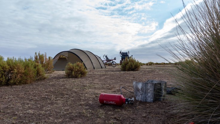 C’est lors de l’ascension (oui un peu exagéré ce mot!) de la 4ème montagne russe que nous capitulons à bientôt 17h30. L’objectif du village fantôme à 7km n’est plus possible. Le vent qui nous laisse sur place et use nos forces, et la côte suivante ne nous laisseront arriver là-bas qu’après 18h30. Trop tard pour arriver sur un bivouac au cas où on devrait trouver une solution de repli. Alors, on envisage de passer les clôtures et de se mettre à l’abri derrière un muret de terre à quelques mètres seulement de la route mais pas trop loin dans ces terres. Personne à qui demander l’autorisation, pas de panneaux, pas de fermier près des lamas qui broutent en contrebas. Sylvain fait le tour et nous décidons d’ouvrir la barrière pour nous installer entre ces murets d’un mètre de haut, cachés. Mais nous ne sommes pas sereins, nous sommes sur des terres utilisés pour les lamas… qui arrivent d’ailleurs de la rivière une heure après. Nous guettons par notre fenêtre de tente l’arrivée potentiel de l’éleveur ou du propriétaire des lieux jusqu’à la tombée de la nuit, sans pouvoir se reposer mais en faisant quand même des mathématiques avec les loulous (faut pas déconner!). On s’accorde pour se dire qu’on ne le refera pas mais on avait peur de finir à la nuit à l’autre bivouac. On croise les doigts pour que personne ne vienne nous déloger pendant la nuit, juste le vent qui fait bouger la toile de notre tente ainsi que le sable qui s’engouffre partout!