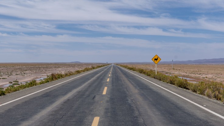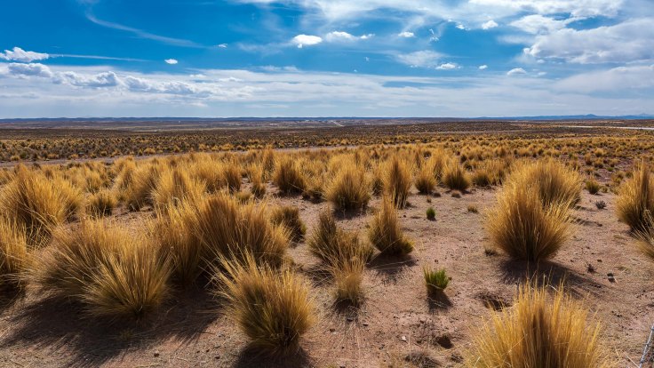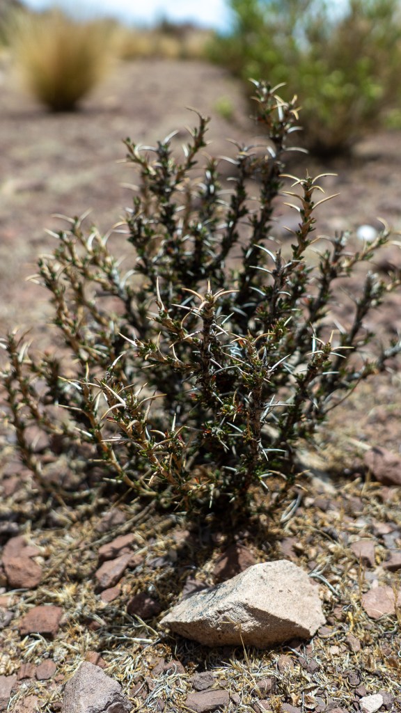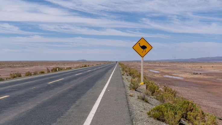On quitte ce campement pour retrouver la route nationale 12, en passant par nos traces de la veille afin de ne pas s’embourber dans la glaise. La chance nous a permis de ne pas avoir de pluie cette nuit ni d’orage. Pas de gadoue du coup ce matin en repartant. A nous maintenant l’asphalte, sur cette route surélevée, comme si nous franchissions un lac avec de chaque côté de la terre rouge, imbibée parfois, souvent avec des touffes d’herbes à l’aspect de chevelure de trolls. Pas d’arbres, ni de buissons, le vent aurait eu raison de leur hauteur. Le soleil est bien présent, heureusement nous nous sommes bien crémés. Même les mains pour moi! Et nous avançons paisiblement, avec quelques minibus ou pick-up qui nous dépassent. Nous restons tout de même vigilants même si nous avons de l’espace car parfois le danger vient des animaux sauvages locaux: les vicuñas et les autruches (!) indiqués par des panneaux de signalisation. Pour les premiers, nous avons pu déjà en admirer 11 sur notre droite ce matin, puis encore d’autres troupeaux un peu plus tard. Les seconds??? Cela nous questionne qu’ils puissent y avoir des autruches en Bolivie. C’est un point que nous devrons éclaircir lors d’une prochaine connexion (sans en avoir vu de la journée).