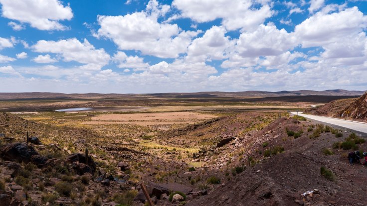 Au bout de 17km, une halte est nécessaire pour ceux qui ont « la dalle », sur le côté dans l’herbe avec une vue sur l’immensité bolivienne: quelques monts par ci par là, quelques bourrelets dans le paysage et ces cheveux trolliens en forme de pyramide qui sortent de terre comme seule végétation à des dizaines de kilomètres à la ronde, à 360°. On se sent minuscule ici. Mais on grignote quand même!