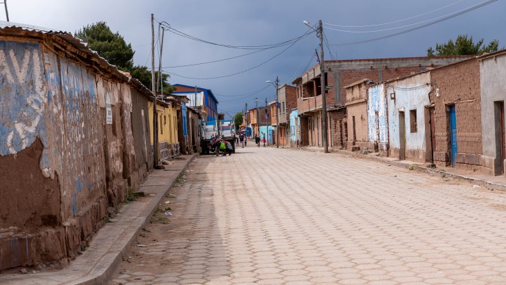 Et nous découvrons ainsi, une autre partie d’Oruro, en évitant le marché qui bloque la rue principale et même la voie ferrée, sur les conseils des proprios. Ça roule bien, on roule bien parmi les taxis. Pas de mototaxis ici, moins de klaxons, ce serait presque reposant. La ville est très étendue et pendant 5km nous prenons la direction du sud puis de l’ouest parmi des ruelles de boue, des pavés jusqu’au rond-point Plaza Circunvalacion. Ici, juste sur la droite, un parc immense de jeux, toboggans, volcan, balançoires, dragons, train… tout en couleurs, donne envie aux enfants. Comme nous sommes de faibles parents, nous décidons de faire le tour afin de connaître les horaires d’ouverture de ce lieu idyllique aux yeux d’Emma et Raphaël mais encore sans vie à 9h52.