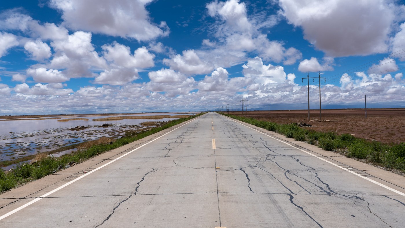 Et ça repart de plus belle, pas nous, mais ce vent et ce soleil! Le plat est terminé pour nous, à l’approche du hameau de Copacabanita (qui n’a rien à voir avec sa grande sœur Copacabana!) puis du Lac Canasa, qui auparavant arrivait au bord de la chaussée. Ce n’est absolument plus le cas aujourd’hui, obligeant les flamands roses à se concentrer sur la dernière « flaque » d’eau à bien 500m/1km de nous. Au grand dam de Sylvain qui ne peut les prendre en photo, mais qui nous permet une petite pause! Nous contournons ce qui reste du lac sur plusieurs kilomètres et commençons nos montagnes russes de la journée: 4 au total.