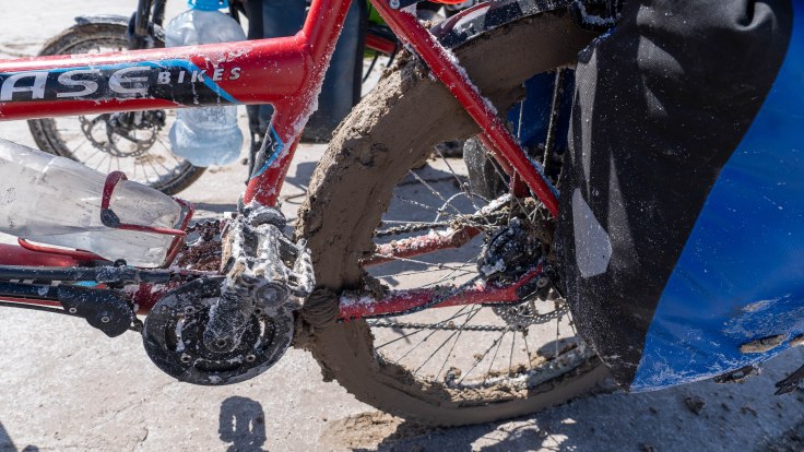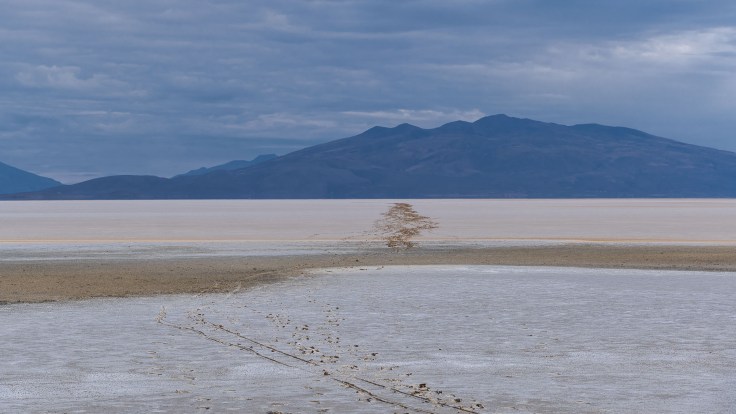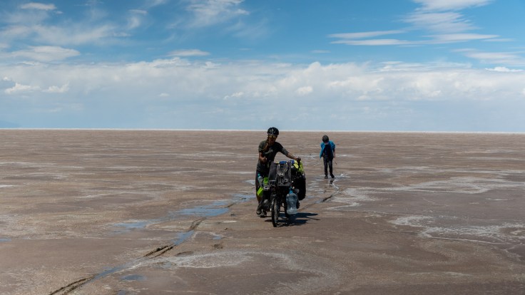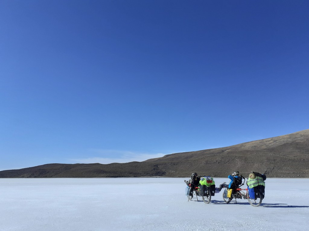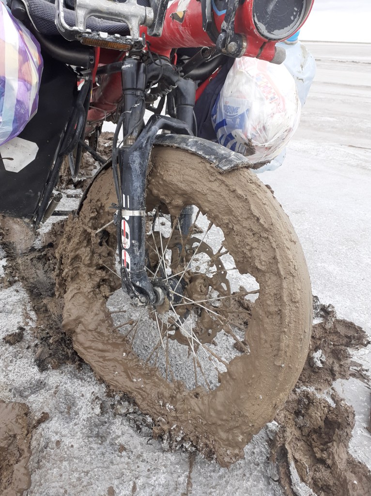 Alors nos roues restent sur place, dans cette terre qui ressort, qui est à fleur de peau du sel. Et là, commence l’effort pour pousser les vélos, pour se remettre en selle, pour croire que le sol sera meilleur par la suite, que les montagnes se rapprochent… 5km. Nous ne ferons que 5 petits km quand nous nous apercevons de notre erreur de jugement. On essaye de couper plus court sur notre droite (à l’ouest) pour rallier un rivage plus proche. Mais nous n’avons pas l’impression d’avancer mieux. Et puis le sol blanc devient beige puis marron clair. Le sel n’est plus. Vive la glaise!