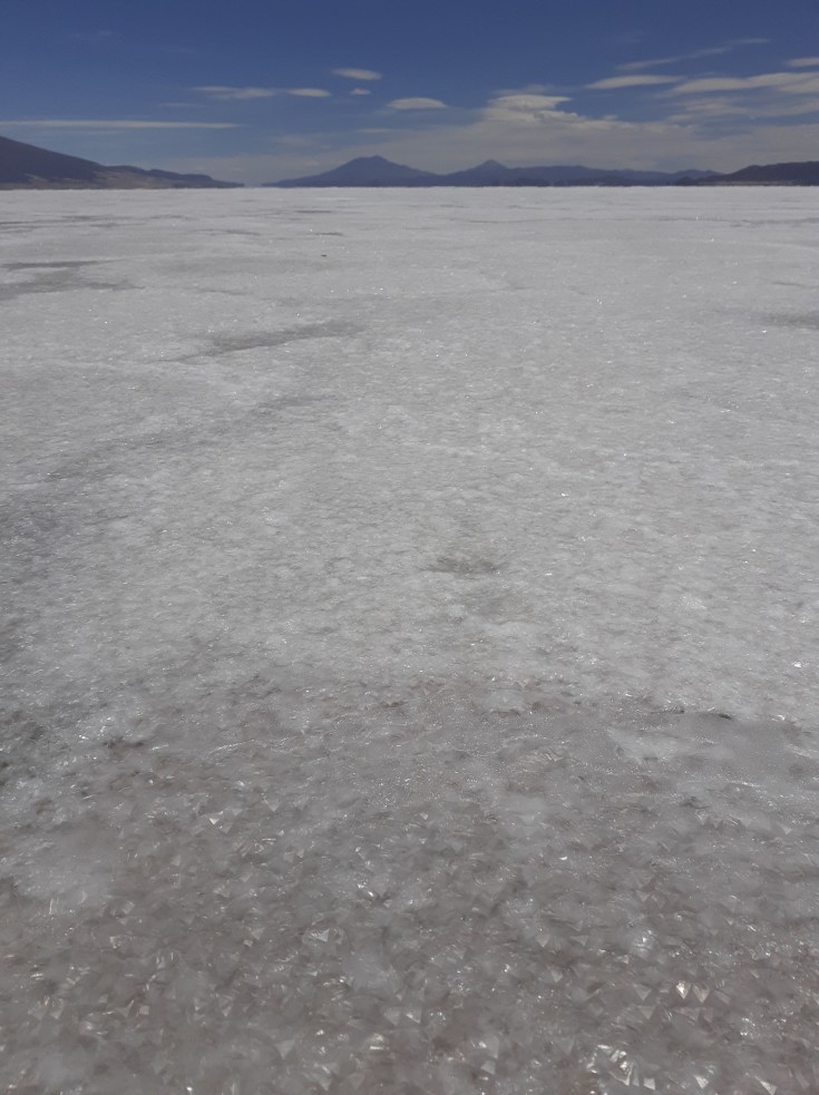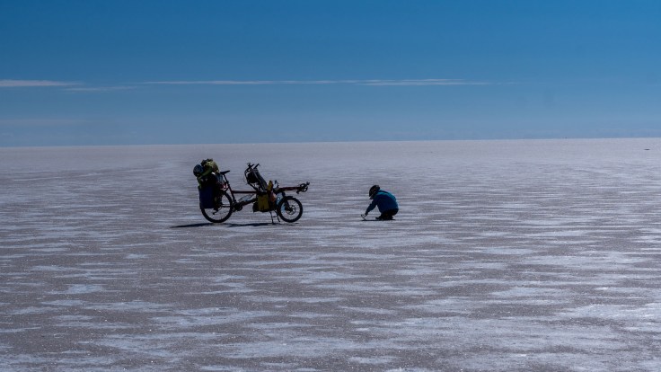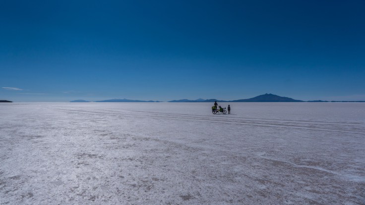 On passe une seconde pointe et le rivage s’éloigne de nous. On vise alors le col entre 2 montagnes et le village de Llica. Il est 10h30. Le salar est à nous, alors on en profite pour le goûter du matin et pour sortir le drone et l’appareil photo/vidéo. C’est l’insouciance du moment. On tourne plusieurs prises, et on remballe le tout, prêts à se rapprocher des îles en face. Elles paraissent tellement près. Mais c’est une erreur, un mirage. Le salar si dur ce matin, se ramollit et est imbibé d’eau à midi. L’effort est de mise pour pédaler plus fortement afin de ne pas trop s’enfoncer ou de ne pas rester sur place entre 2 plaques. Les montagnes sont encore à 20km de nous, ce qui ne paraît pas. Nous avons le choix entre prendre une « tracé » de passage pour les voitures sur le salar mais qui rallonge de 16km, ou foncer tout droit, au plus court.