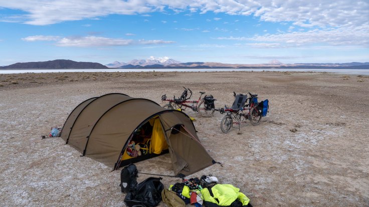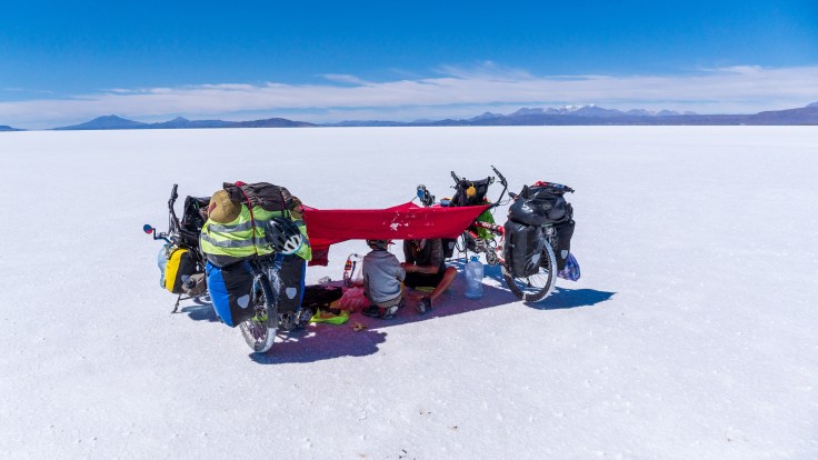 Et comme à son habitude, la famille s’agite dans tous les sens (enfin que 2 spécimens), de chaque côté de la tente aux 2 entrées, sur les vélos, à l’intérieur aussi, sous les vélos pour la vaisselle. Et les enfants, placides, tranquilles, vont finir leur repas sur les rochers de notre île, en tongs avec le soleil et le vent. Il est 8h20 lorsque nous laissons notre havre de la nuit pour traverser la mer de sel, blanche, immaculée, silencieuse.