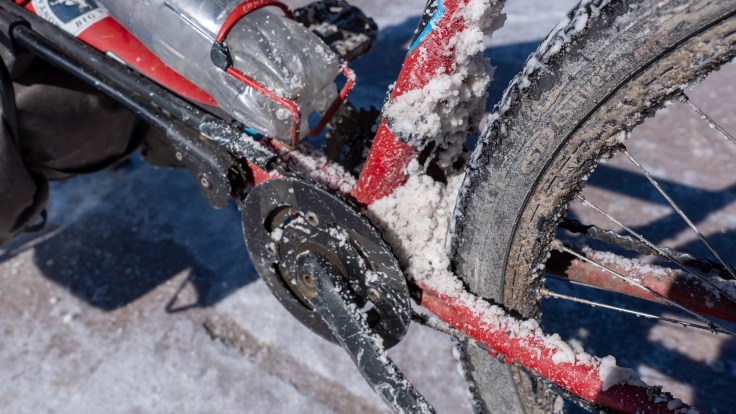 On pédale les deux vélos à côté, on fait des zigzagues, on rigole, on cherche la roue en plastique lancée hier et balayée par le vent, on écoute de la musique sur le Panzer qui a retrouvé son équipage Emma/Papa, on chante sur le Couillot toujours la même phrase, et on avance. 7km sur du sel dur comme de la pierre, qui crisse sous nos pneus, qui envoie du sel sur nos chaussures et nos sacoches, qui brille, qui nous aveugle, qui nous enchante…