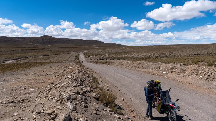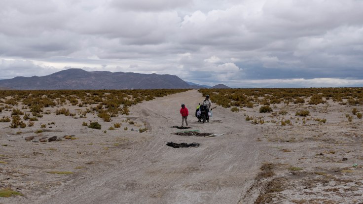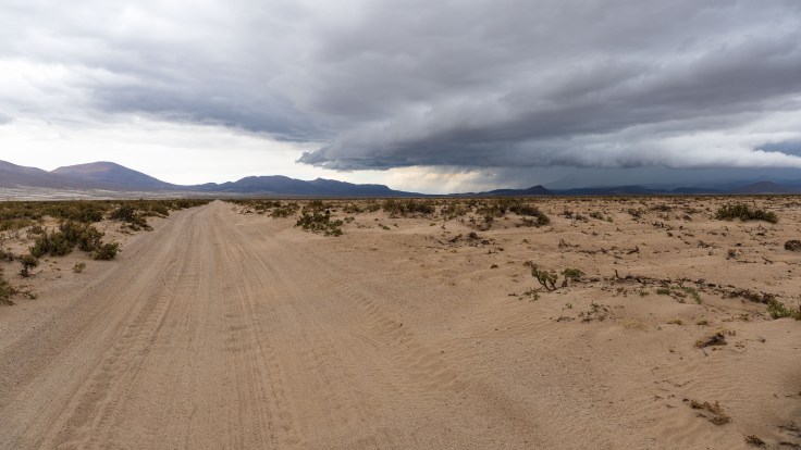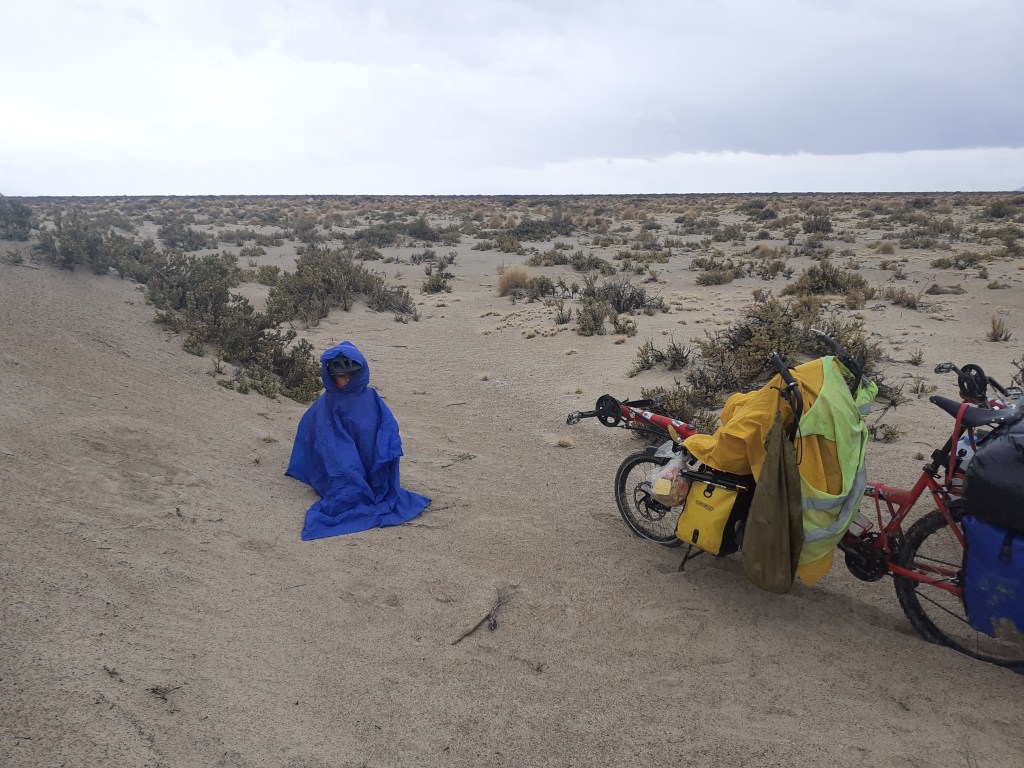15h, quand enfin nous pouvons partir vers le sud, avant la pluie au loin, mais heureux d’être à nouveau autonomes. Des champs de quinoa de part et d’autre nous font comme une allée, sur 5km de route sablonneuse. Ensuite, les terrains ne sont plus utilisés pour l’agriculture. Les buissons et touffes d’herbes poussent dans le sable. Le vent est là aussi mais de dos. Et il ne lésine pas pour nous aider. Nous pédalons, le regard à l’ouest, sur notre droite où les rideaux de pluie s’en donnent à cœur joie et se rapprochent. Et c’est pour nous, peu avant 16h. Ce qui sonne le glas de notre avancée.