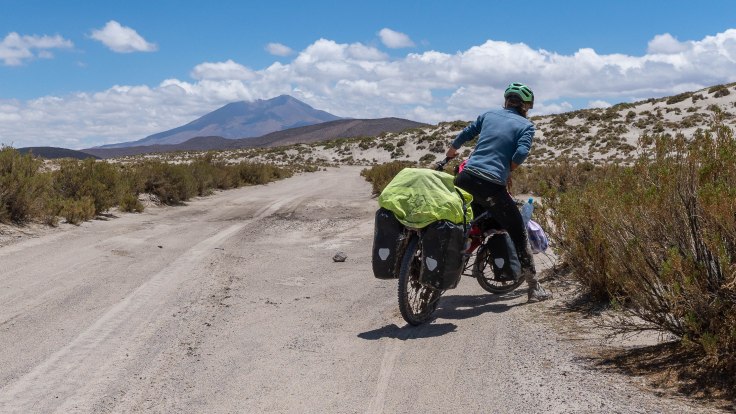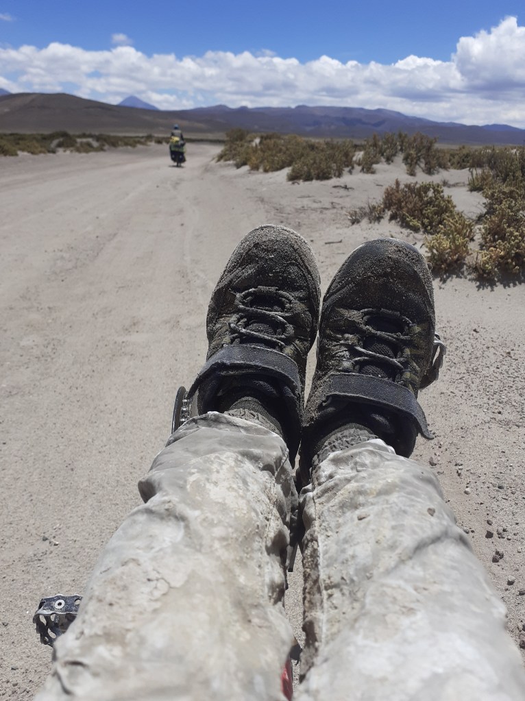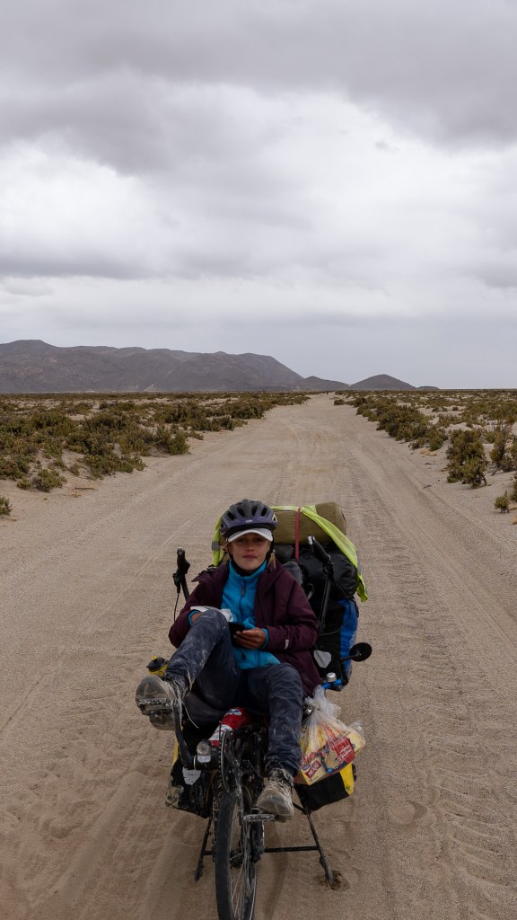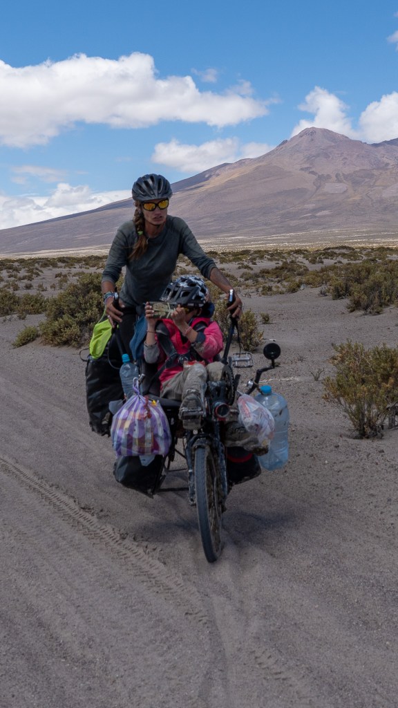 Le rivage a été célébré par un petit goûter avec ce que nous avions. Un temps de pause pour apprécier le parcours effectué ce matin. On savait alors qu’on ne serait pas à Llica aujourd’hui, la ville au pied du salar d’Uyuni, que nous pensions déjà atteindre hier soir! La suite? Du sable parmi les buissons avec des terriers qui s’effondrent sous notre poids et où les roues adorent s’y coincer, sauf avec un gros effort de poussage de notre part. La motivation de Raphaël baisse. Alors on partage les objectifs. Le premier: un sentier à 1km. Le second: les 4,5km de sentier. Le troisième: une route pour atteindre le hameau de Hizo. Dernier objectif: le village où nous pourrions trouver de l’eau pour aller sur la route de Llica, 30km plus loin et s’arrêter bivouaquer où on veut.