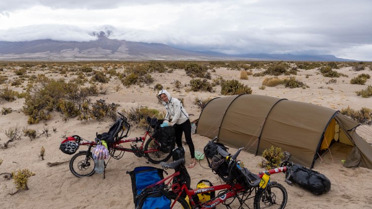 Mieux vaut trouver un bivouac à côté de nous, comme derrière ce petit monticule de sable, pour un abri au vent. Les ponchos mis aux enfants, nous poussons (encore!! mais pour la dernière fois de la journée) les tandems sur les 100m qui nous éloignent et nous cachent ainsi de la route. La pluie, les nuages noirs et le vent refroidissent cet fin d’après midi, et cachent le sommet des volcans autour du salar. La tente montée, les enfants y entrent et non sans mal essayent d’enlever les pantalons et chaussettes dures, salies par la boue et le sel séché. Et dire que demain matin, il faudra les remettre! Les matelas et les duvets installés, ils peuvent jouer pendant près de 2h à leur playmobils et objets trouvés sur le sol (pion d’échecs ou dessus de voiture de pompiers sans ses roues). Les parents engloutissent une autre moitié du butin de pirate de la tienda de Hizo.