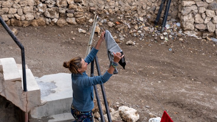 Nous petit-déjeunons tous les 3 parmi le sable sur le tarp dans l’abside. Nous sommes déjà bien couverts, quand nous en sortons pour finir de sortir nos affaires de la tente et ranger les sacoches. Les chaussures sont dans un état désastreux, de sable et de boue séchée. Et il faut les remettre avec des chaussettes propres… sauf pour moi. Que c’est désagréable! Vivement que le père Noël m’amène de nouvelles socquettes. Nous parvenons à être prêts vers 8h40, sous nos vestes de pluie, doudounes et gants, après avoir fait une rencontre fortuite avec 2 petits scorpions couleurs sable, cachés sous le sol de notre chez nous.