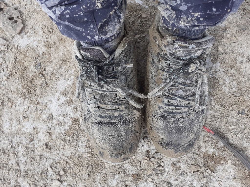La capitulation est proche. On abandonne nos vélos dans le salar, enfin dans la boue. On enlève les sacoches les plus importantes pour la nuit: tente, duvets, nourriture, on se charge et on marche. On glisse plutôt mais l’île paraît se rapprocher rapidement. 800m de nous. Emma en tête, suivi de Sylvain, Raphaël et moi, main dans la main. On garde le moral car Emma a foulé la terre ferme de cette île déserte. Il est 16h.