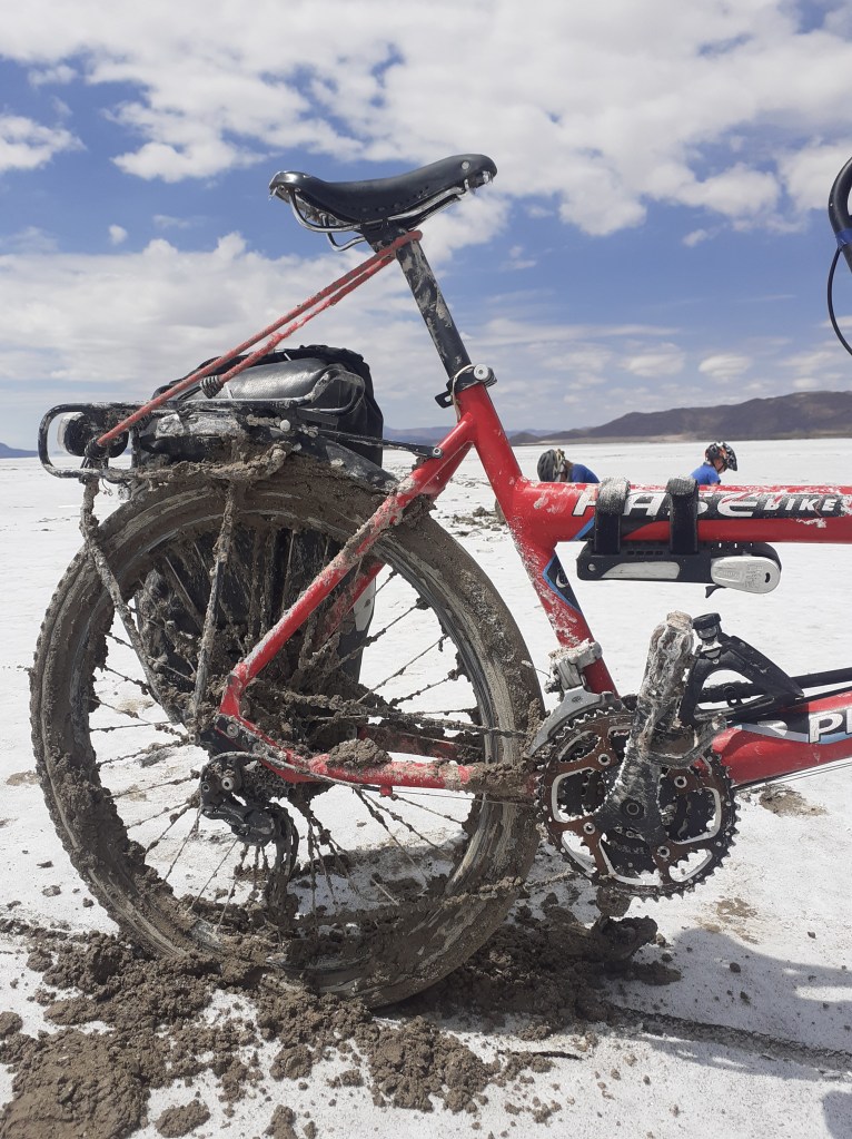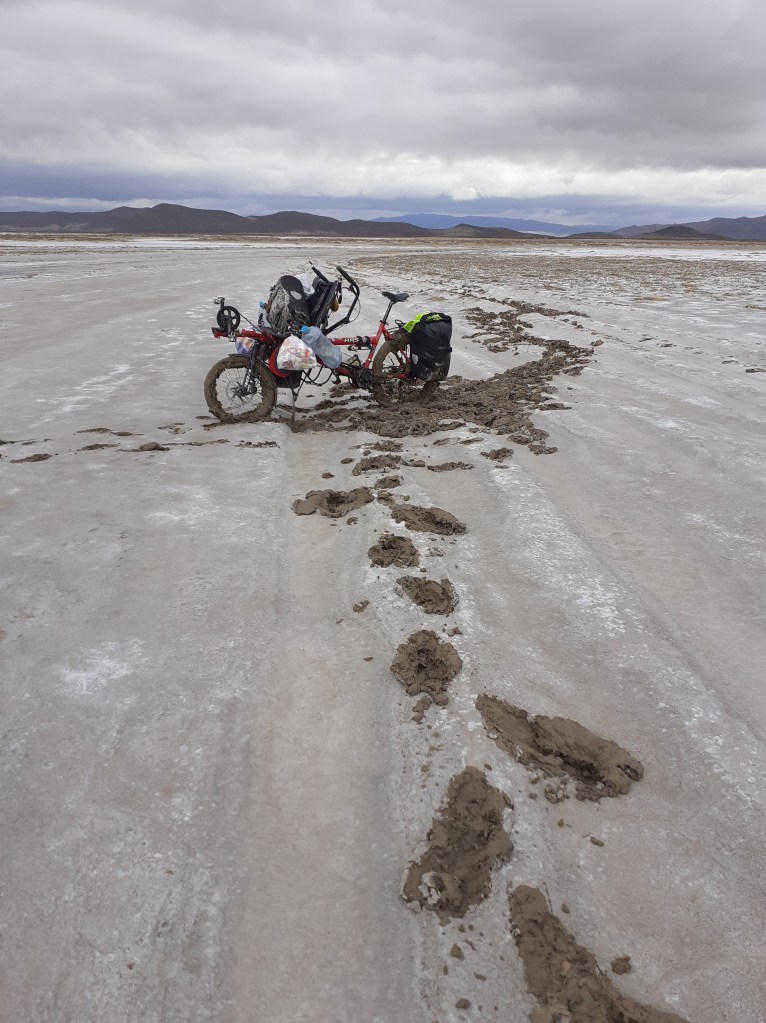 La bonne glaise qui colle aux roues. Qui colle aux baskets quand on descend pour pousser le vélo. Qui ne nous permet plus d’avoir un équilibre et d’être bien ancré au sol. Qui nous permet même de faire du patin à boue avec nos chaussures. Qui empêche les roues, les 2, de ne plus tourner mais de glisser. Qui embourbe nos vélos, si si, c’est possible. Nous ne le pensions pas, mais le salar de Coipasa l’a fait: les vélos, ça peut s’embourber au point de ne plus avancer d’un centimètre. Véridique. On racle la boue sur les roues avec 2 bouts de bois et le couvercle d’une conserve. On roule à peine 1m. On pousse à deux un vélo, résultat: on se casse la figure et le vélo ne bouge pas. Vraiment, les 10cm de glaise à la surface du sol se mettent sur nos roues, se coincent dans les freins, les rayons, le garde boue… Une horreur. Et là, après avoir fait 50m en 30min, on se rend compte qu’on n’arrivera pas au rivage le plus proche à 4,5km avant la nuit. Impossible. C’est mathématique. On fait comment?