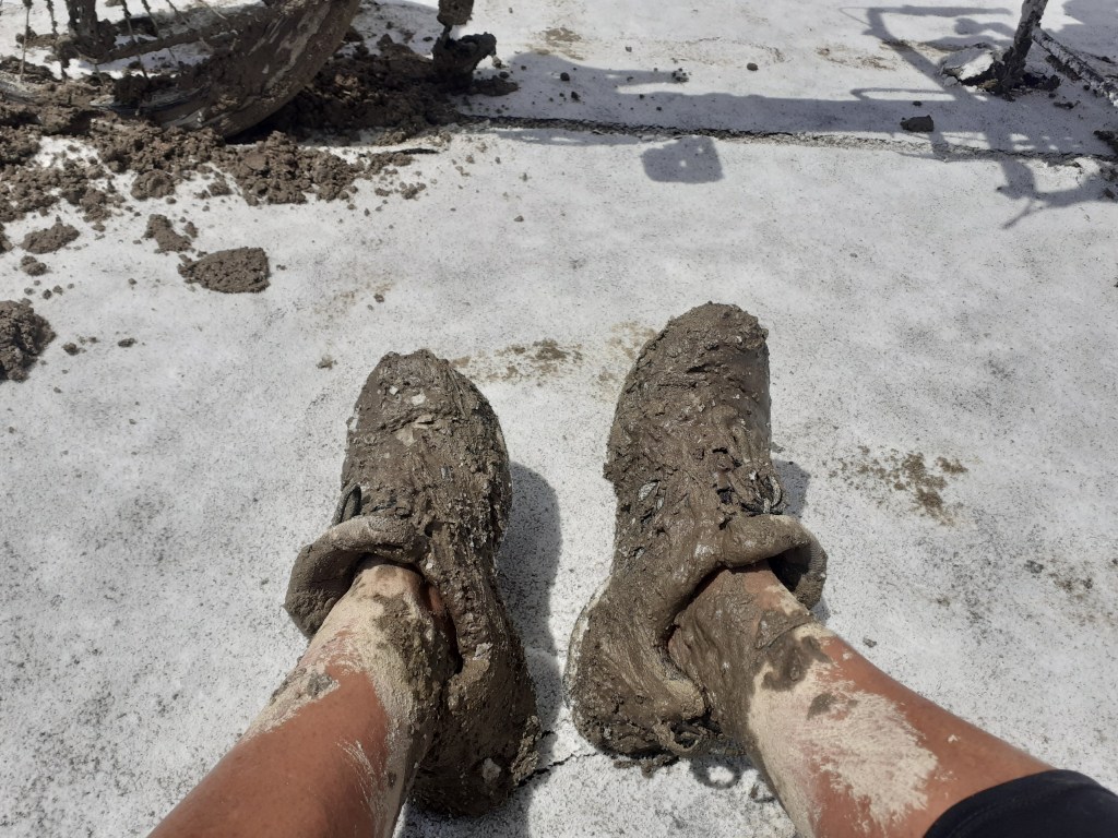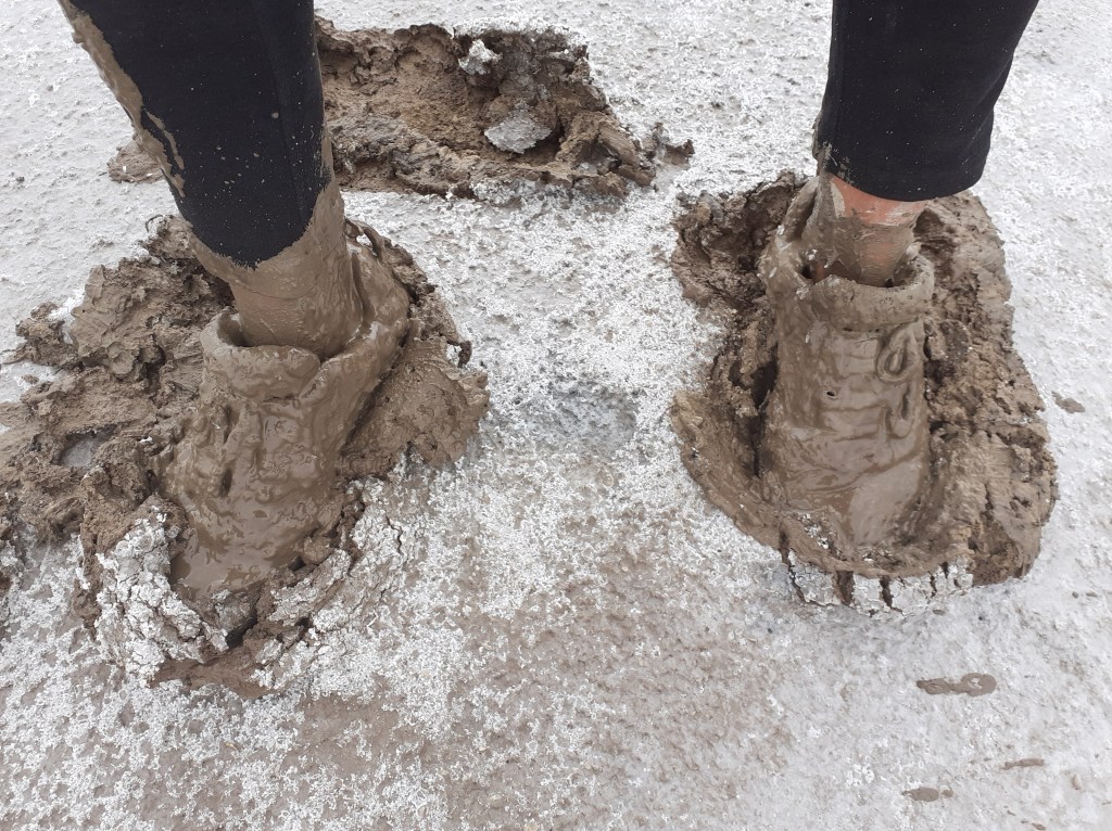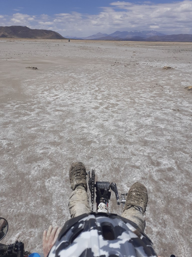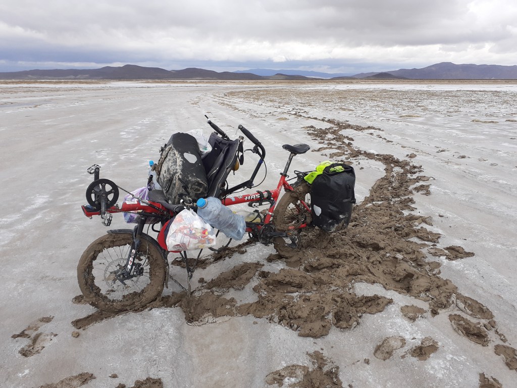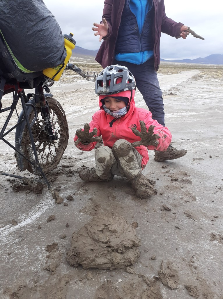 Les 4,5km qui nous séparent de la terre ferme, ne nous font pas peur. Et puis la vue de plusieurs sillons faits par des cyclos, nous rassurent. Comme si nous n’étions pas seuls. On a l’impression de la voir proche cette terre au pied des montagnes, mais ce sont encore des mirages! L’important est que nous progressions. Pour les enfants, c’est plutôt de jouer avec la glaise au sol! Chacun son jeu. Le nôtre va devenir un vrai cauchemar au bout de deux kilomètres. Notre insouciance et notre motivation, notre objectivité de penser que l’on n’a pas mis trop de temps pour faire presque la moitié du trajet, vont prendre un coup derrière la nuque au km2. On cherche les surfaces bien blanches, on reste dans la direction du village de Hizo, notre but de ce midi. Mais cela n’a pas fonctionné. Après 1h à traverser le salar en poussant les tandems et en mangeant de l’énergie, le sol est devenu beaucoup plus meuble. On s’est enfoncé un peu plus, nous obligeant à pousser davantage, en soulevant comme on peut, l’arrière de notre vélo par la tige de la selle, seul, et en glissant avec nos chaussures redevenues marrons. Ça y est, on est dans l’inoubliable. Ça y est, on est dans la merde.