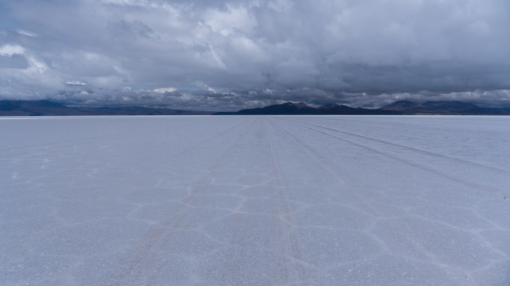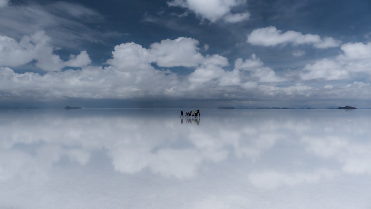 Une fois décidé, comme par hasard, la pluie cesse et on s’active pour laisser notre chambre gracieusement prêtée pour 2 nuits, et on quitte la mairie de Llica à 7h50. C’est tôt mais vu les kilomètres à parcourir et notre allure moyenne de 10km/h, nous voulons mettre toutes les chances de notre côté pour ne pas finir à la nuit. Une fois quittés la rue principale, la route devient de la terre, avec par endroit, des flaques et de la boue, mais c’est très praticable car de nombreux véhicules passent par ici et nous roulons donc à une vitesse honorable. Quelques virages, peu de côtes, une belle vue sur l’horizon blanc et ses montagnes autour avec le soleil qui troue les nuages, quelques voitures passent dans notre sens, nous avançons bien tous les 4. Et puis, la route se poursuit tout droit, dans le salar, avec encore un peu de terre… laissant la suite au sel. Quelle sensation! Le sol est effectivement dur, nous pouvons rouler dessus, parfois parsemé de grandes flaques d’eau où le sel craque sous notre poids, avec nos roues qui s’enfoncent un peu plus à ces endroits.