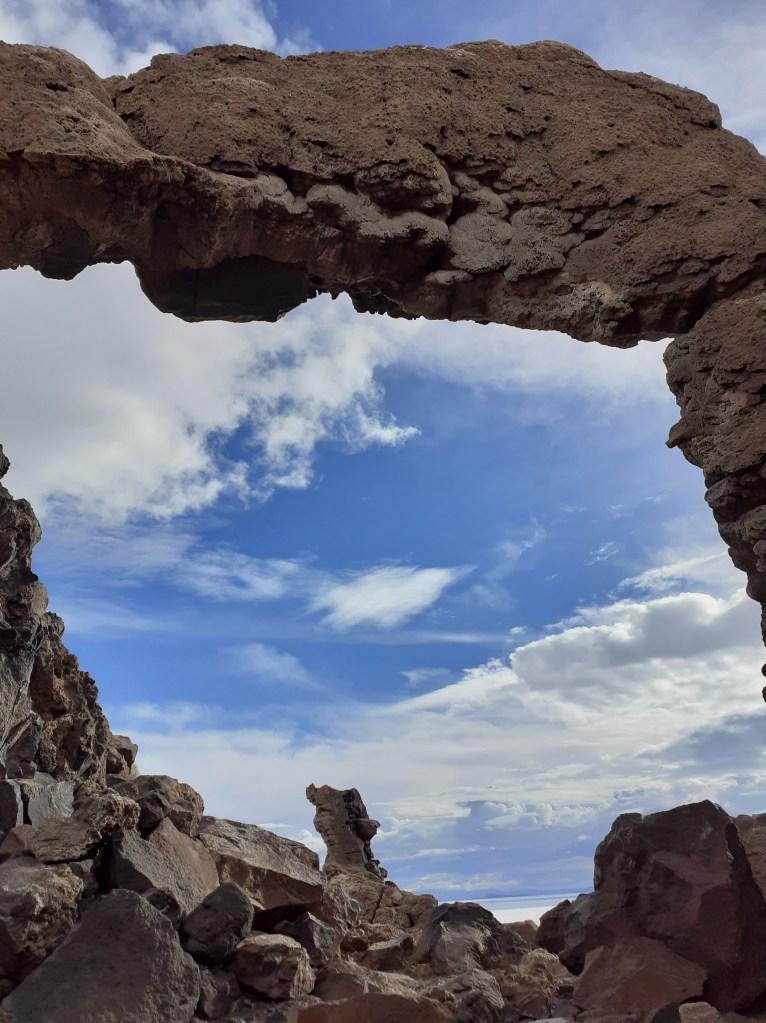 De retour aux vélos, Adolfo nous propose de disposer du refuge… une pièce sans fenêtres, avec 3 matelas au sol. On hésite car c’est gentil de sa part de nous le proposer mais nous devons attendre 17h pour y mettre nos affaires. Après réflexion, une sieste sur un banc pour certaines, une balade pour certains et des jeux avec leur balles pour d’autres, nous déclinons et trouvons un campement à quelques mètres de là, aux abords du salar. Bingo, on y fonce, détachons les sacoches et les passons par-dessus un muret. Sylvain monte la tente pendant que je file faire la vaisselle au robinet! Un luxe. Je me permets de retourner à la randonnée de tout à l’heure, pour passer sous l’arche Coral et faire quelques photos de ces galeries que nous avons loupé. Ces labyrinthes de roches me transportent ailleurs pour un instant avec le soleil, le ciel bleu et le salar à la sortie… et un bus qui approche!