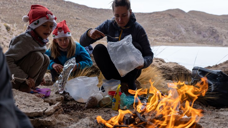 Après une bonne et longue nuit de sommeil, 6h38, je me réveille naturellement avec Raphaël et Emma à mes côtés. Sylvain est déjà debout et a pu faire un feu à l’abri du vent et des quelques gouttes de pluie au-dessus de la tente. Je m’habille la première forcément, rejoignant Sylvain pour un thé chaud et laissant les 2 zouaves rigoler et faire n’importe quoi dans la tente. Ils arrivent avec leur beau bonnet de Noël en doudoune et tongs au coin du feu. Un lait au chocolat chaud réchauffé sur les bois de cactus fait du bien à Emma. Raphaël a déjà bu le sien froid d’une traite.