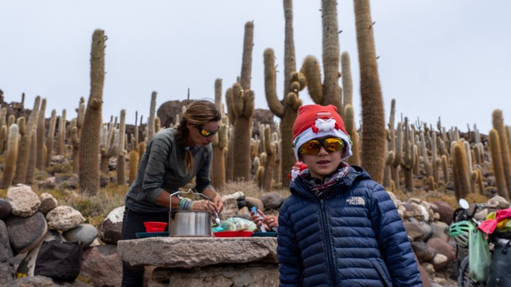 Le vent redouble de force. Nous redoublons de force également sur nos pédales. Je décompte pour Raphaël les km (un peu à vue de nez pour ne pas sortir mon téléphone et perdre du temps) ce qui le motive. Sylvain arrive sur le rivage de l’île déserte. Celle-ci n’appartient qu’aux cactus et viscaches (lapins des Andes à la longue queue): ça nous plaît!!! Mais nous, nous avons pris du retard, et avec le vent qui nous déstabilise car il est de côté, du Nord, de mon côté gauche. Alors, j’essaye de serrer au maximum les poignées et je me concentre sur ce petit point jaune au milieu de l’île (le gilet de sécurité de Sylvain accroché à l’arrière de son vélo). Nous accostons enfin à 15h30, Raphaël rejoignant Emma qui s’est déjà fait une cabane et moi Sylvain, parti en repérage pour un bivouac à l’abri du vent. Une plage sur l’arrière en arc de cercle sera presque idéale! Nous montons la tente pendant que Raphaël, notre explorateur et aventurier, part récupérer du bois, avec les règles de prudence qu’il connaît bien maintenant : avec les pieds pour éviter les piqûres de scorpions! Emma joue aussi sur la plage, en récupérant un morceau de caoutchouc sur un déchet pour faire un garde-boue à ma roue arrière et éviter les projections! Quels enfants extra! Alors, pour leur faire plaisir, nous décidons de leur offrir maintenant les bonnets de Noël que nous avons acheté à Oruro, il y a plus d’une semaine, pour qu’ils en profitent un peu et marquer le coup de ce Noël.