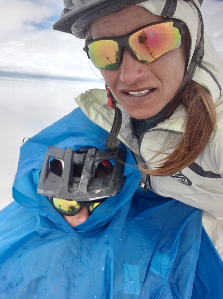 Le salar nous attend, la route Colchani-Isla Incahuasi est à nous, en contournant l’île par le Nord. Direction l’Est pour la ville à 74km. Le salar est recouvert d’eau sur quelques centimètres. Les projections de sel sur nos chaussures et chaussettes se renouvellent. La pluie également, ce qui nous force à mettre les ponchos (les pantalons de pluie étaient déjà enfilés pour le vent). La journée va être longue avec ces ingrédients: vent de côté (droit), pluie, froid, humidité avec ce lac sur lequel nous roulons. Mais on y va, on s’y lance et en musique avec la playlist de Raphaël sur le Couillot. Pendant les 2 premières heures, rien n’est visible autour de nous, que du brouillard et de la brume à l’horizon. On ne distingue pas les bords du salar, ni les montagnes. Drôle de sensation cette infinité. Heureusement, Emma joue les GPS et nous guide sur la bonne trace. Nous roulons à 8km/h, c’est mieux qu’hier mais pas suffisant pour vraiment espérer ne pas arriver trop tard de l’autre côté. Côte à côte, les 2 vélos avalent les kilomètres moins vite que les 2 bus qui nous doublent sur notre gauche. Ce sont ceux qui partent de Llica à 5h tous les jours. A 9h10, nous faisons notre première pause les pieds dans l’eau… souvenez vous, c’est un lac! Nous avons roulé sur 16km sous la pluie en 2h. Donc pour faire nos 62km avant la première île où nous pourrions nous poser au cas où, il nous faut faire encore 6h de vélos, en gardant cette cadence. On a fait 1/4 du trajet. En attendant, pour éviter aux enfants d’avoir les pieds trempés à l’eau froide comme nous, Sylvain porte Raphaël pour aller aux toilettes, Emma gardera ses poches plastiques aux pieds.