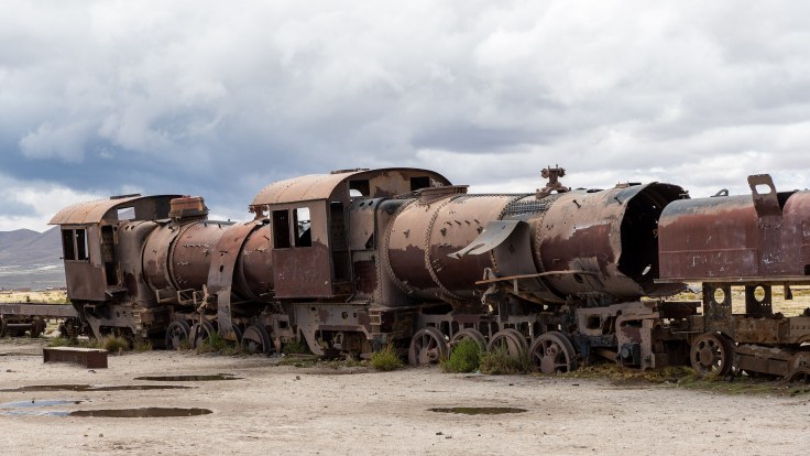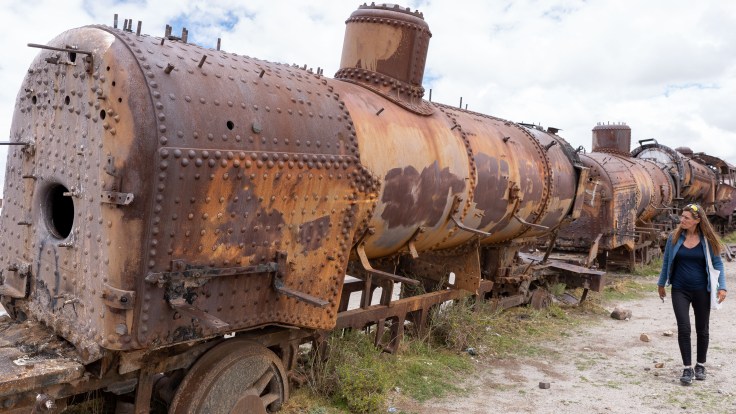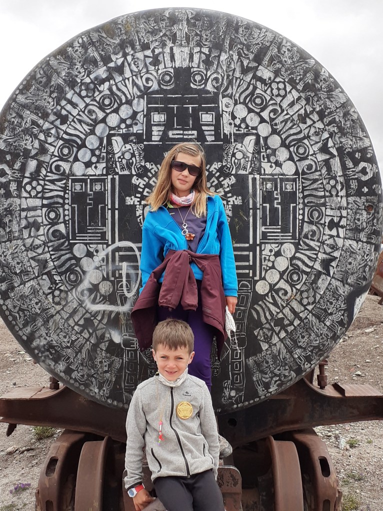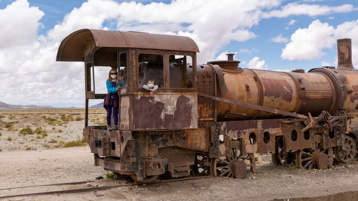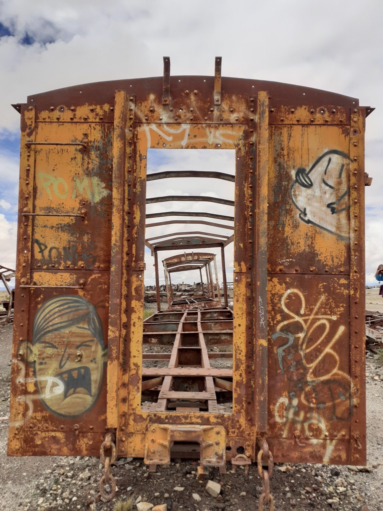 Nous faisons même un petit tour au cimetière des trains, où nous découvrons des machines rouillées, peintes, désassemblées, d’un autre temps, où nous pouvons monter dessus, dedans, dans la chaudière…