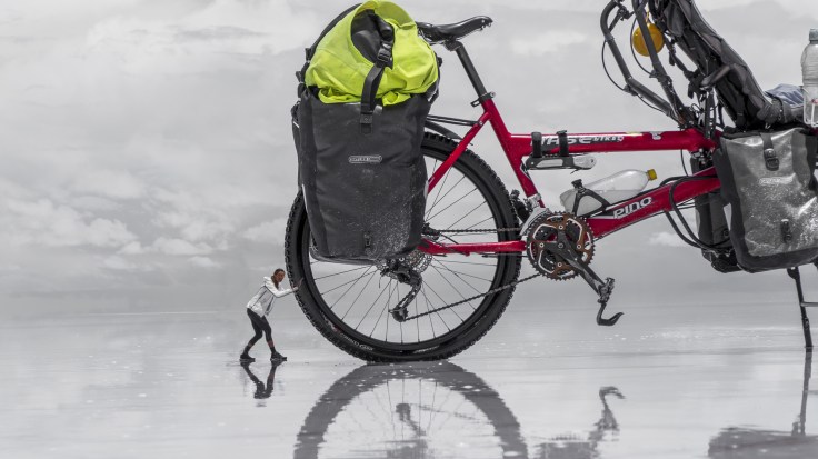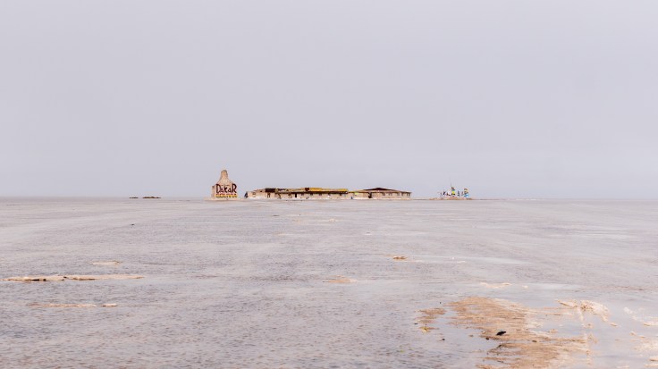 Dès le début, les roues sont dans l’eau sur quelques centimètres. Nous passons devant le monument du Dakar, les pieds dans l’eau lui aussi. Pas de photo sous la pluie, nous continuons notre séance de pédalo du jour! La trace des 4×4 est bien visible sous la surface, blanche et orange et elle nous conduit droit vers le rivage. 7km ainsi, à flotter sur l’eau, sur ce lac salé, à avancer même si nous sommes un peu freinés par cette petite profondeur aquatique. Mais la pluie a cessé, des éclaircies percent parmi les nuages, les hôtels de luxe en sel du rivage se rapprochent, les montagnes derrière aussi. Alors nous pédalons avec entrain (nous nous arrêtons sur les rares îlots de sel de 3cm au-dessus de l’eau) pendant 1h jusqu’à atteindre la route d’accès des camions pour l’exploitation du sel.
