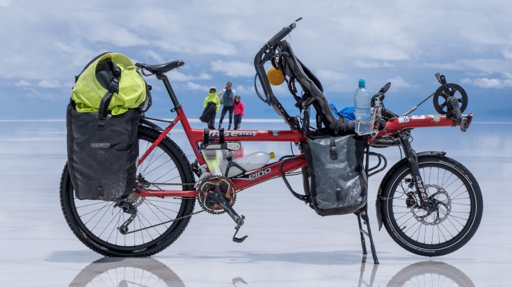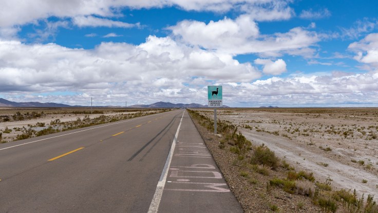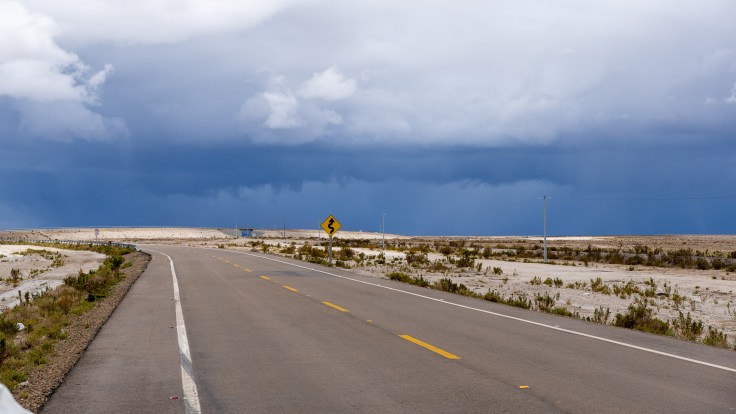 Ah, que c’est doux, que c’est lisse, que ça roule bien! 21km comme ça, ce n’est que du bonheur… sauf que notre ami, le vent, est revenu. De face bien sûr! C’est cadeau! On buffle encore, on appuie fort sur les pédales, on joue à « ça commence par » avec Raphaël, on ramasse des déchets sur la route, on admire des vicuñas puis le salar encore sur notre droite, et on rencontre un cyclo, Francisco. Un équatorien travaillant en Argentine et qui retourne chez lui dans le Nord va faire un petit tour dans le salar.