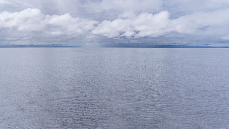 En selle, le temps change radicalement. Des nuages noirs apparaissent sur notre gauche. Notre point de repère au fond du salar, une montagne de forme pyramidale, disparaît sous la pluie avec de beaux nuages gris imposants. Notre cadence à nouveau est un peu plus rapide avec un vent de côté mais légèrement de derrière. Très légèrement. Mais on peine moins et désirons arriver rapidement sur la berge.