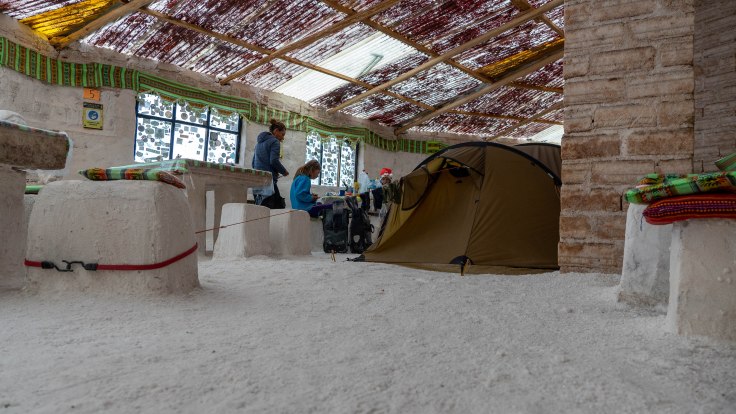 Le parking est rempli de 4×4… tout comme la salle commune construite en sel de l’établissement. Elle est bondée de familles, venues déjeuner. Il est un peu plus de 14h quand nous y entrons pour demander l’autorisation de camper ici, vu que dehors c’est la piscine. Ils acceptent mais après le départ de tout le monde vers 18h… Ça nous laisse le temps de pouvoir déjeuner un peu ici, ce qu’ils acceptent: nous pouvons prendre une table libre (toutes les autres sont dédiées aux tours opérateurs). On peut même entrer avec nos vélos sous la tente messe sous les applaudissements, svp!