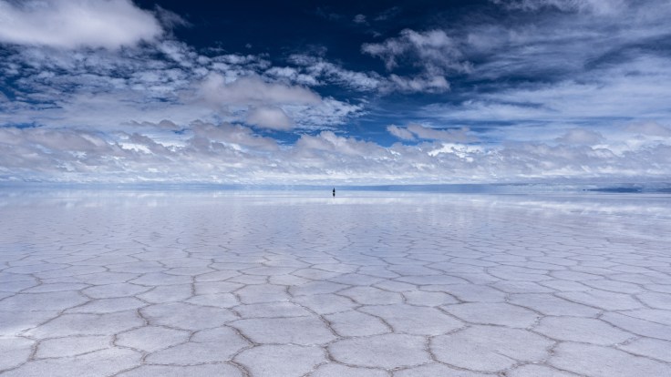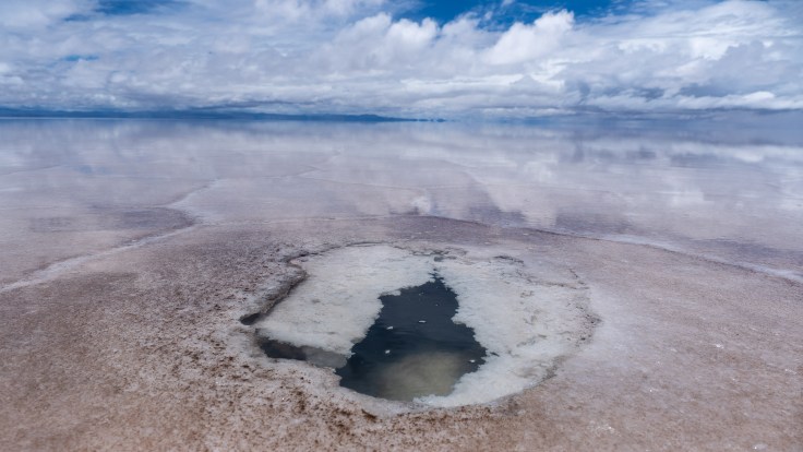 A 11h30, au km 35, Raphaël a faim et il accepte d’attendre 30min de plus, histoire que nous atteignons les 40km… sans succès. Mais nous avons fait plus de la moitié! Extra, non? Tout est possible du coup, de penser que l’on peut y arriver. Le panorama autour de nous se découvre un peu, quelque montagnes sont visibles sur notre gauche. Le sol est toujours trempé mais une particularité se dégage: le sol est comme en dalle de pentagones ou hexagones, de couleur orange ou blanche. Parfois, parmi celles-ci, il y a des trous. Et surprise : dessous c’est de l’eau! Nous qui pensions naïvement que sous le sel, ce n’était que de la terre et que nous ne craignons rien! Alors entre le km30 et le km38, nous zigzaguons entre ces trous, ces cavités pour éviter d’y planter le vélo, et par prudence, au vu de la profondeur de l’eau dessous, Raphaël enlève les bretelles de son harnais. Le soleil revient… idéal pour notre pause de midi!