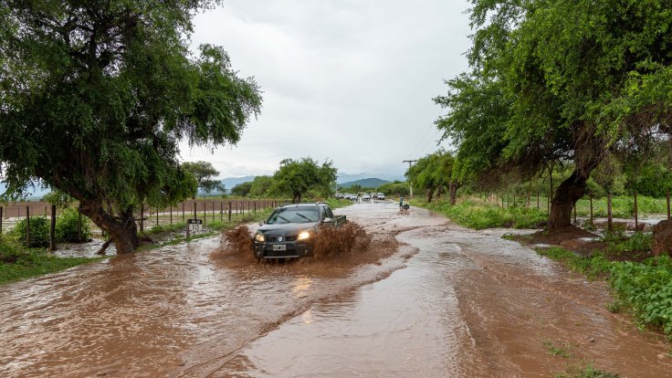 La zone urbaine terminée, nous retrouvons nos paysages de prédilection mais dans les camaïeux de gris. Tout est fantomatique, les montagnes ne se distinguent que par l’intensité de leur gris. Le lac « Rio Guachipas » sur notre gauche, subit le même sort, où nous devinons à peine sa surface devant la chaîne de montagnes. Certaines sont même recouvertes par les orages… et les éclairs! Ça y est, ça tonne fort tout autour de nous. La pluie n’a pas cessé et inonde la chaussée. Une voiture venant en sens inverse, s’arrête à notre hauteur pour nous prévenir, que dans quelques kilomètres, la route est coupée par des inondations. L’eau est à 80cm, nous ne pourrons pas passer, nous disent-ils. C’est vraiment gentil de nous prévenir, ce que fait également un motard 1km plus loin, qui lui a préféré faire demi-tour. Quant à nous, nous préférons avancer, quitte à bivouaquer juste avant si vraiment c’est infaisable.