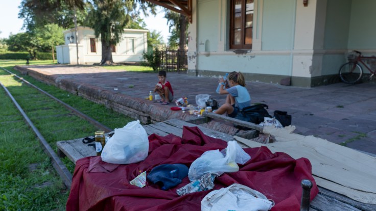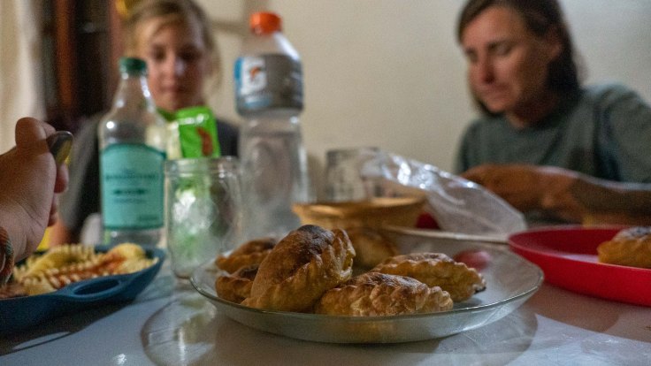 Et puis, finalement, avant La Viña, perdu dans la pampa, un restaurant se propose hôtel également. Ça vaut le coup de demander pour la nuit, car vu les terrains autour de nous, celui du camping risque d’être une piscine! Bingo, ils ont une sorte de petite maison/cabane avec un salon, deux chambres et de l’espace pour nos affaires. Nous n’irons pas plus loin pour aujourd’hui. Le temps d’enlever tous les vêtements mouillés aux enfants et ils sont déjà sous la douche, nous les suivrons. Un peu d’école, un peu de jeux sur le téléphone, une petite boum musicale improvisée dans leur chambre, du tri de photos, de l’écriture, un peu de goûter, un peu d’apéro, de l’électricité revenue après une coupure dûe à l’orage, un peu de danse et de spectacle de la part de Raphaël sur Queen (Emma est devenue timide en danse…), et notre après-midi passe.