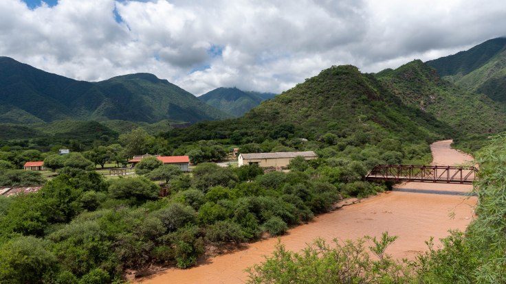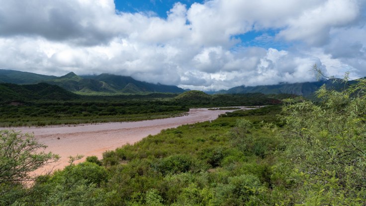 Faut tout de même pédaler aujourd’hui en direction de Cafayate, par la route des vins, et on le fait avec un ciel bas, tout gris, ne laissant entrevoir que les pieds des montagnes, les chevaux dans les près, les vignes de raisins rouges, les haciendas ouvertes pour les visites, des montagnes russes sur la route, des sourires encore, de beaux panoramas, le Rio Guachipas avec son fort courant et son eau marron et une végétation folle… Les 20 premiers kilomètres de la journée se font ainsi, tranquilles, en musique sur les 2 tandems et sans pluie! Il commence même à faire chaud et humide quand le Couillot fait des siennes dans une côte. La chaîne se bloque alors Sylvain propose une pause à l’ombre pour y regarder… un maillon de chaîne est cassé…mais il a de quoi le remplacer. La patte de fixation du dérailleur est tordue depuis un incident à la fin du Salar d’Uyuni, ce qui nous cause tous ces problèmes de dérailleurs… Cette patte est spéciale sur les Pinos et nous n’avons aucune solution de remplacement si ce n’est de faire usiner spécifiquement une pièce dans un atelier de mécanique aluminium… aucun magasin de vélo rencontré depuis Uyuni ne disposait de l’outil adapté pour réaligner correctement la patte, et nous avons donc un dérailleur qui souffre d’un mauvais alignement… Malgré un dérailleur neuf, nous avons toujours des problèmes dès que la chaîne est un peu sale…