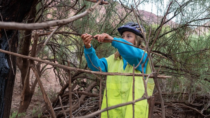 Quelques virages et c’est fait entre la route et la rivière, mais bien en hauteur par rapport à son lit. Le choix est validé rapidement, pas d’hésitation possible car nous nous faisons arroser, tremper même! Les vélos sont descendus sous la pluie pendant que les enfants sont à l’abri sous un arbre. La tente est montée de suite, les sacoches dessous… quand le soleil revient! Parties de cache-cache en somme. La fin d’après-midi se résume en cabanes dans les arbres avec les branches trouvées (à deux endroits différents), promenade photographique, sieste, épilation, écriture, jeux avec les feuilles minuscules des arbres servant de café ou autre selon l’imagination, écoute de Podcast « Les Voyages d’Amélia au cœur de l’Histoire » (les enfants vous les recommandent!), promenade au bord de la rivière, mise en place des lits… Je vous laisse deviner qui fait quoi!