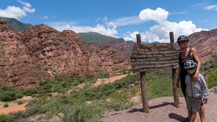 Il n’est que 13h lorsque débute notre après-midi vélo. Nous remontons en aval le Rio de Las Conchas, faisant parti du Parc National de la Quebrada de Las Conchas. Ce sont 12km dans les gorges, parmi ces roches datant de 90 à 60 millions d’années, concentrées en oxyde de fer qui donne cette couleur si ocre et rouge. Quel contraste dans les teintes naturelles: que d’intensité dans le bleu, le vert et le marron. C’est tout simplement sublime et grandiose, d’où notre positionnement si petit! Les petites côtes se succèdent avec de légères descentes, parfois des dos d’ânes inversés que l’on imagine facilement inondés hier.