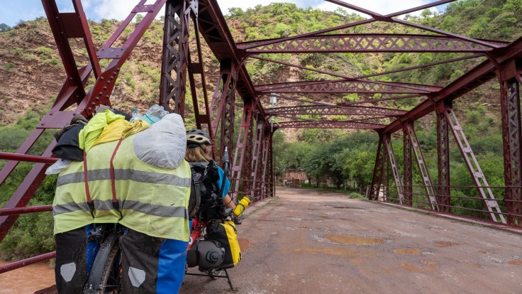 Une dizaine de voitures est arrêtée en warning sur la route, 2 rebroussent chemin. Pas très engageant. Une dernière voiture nous indique qu’il y a un autre court d’eau plus conséquent que celui-ci, dans quelques kilomètres encore. Sylvain, plus téméraire que moi, avance jusqu’au ruisseau… qui n’est en réalité qu’un torrent marron barrant la route. Des voitures sont de l’autre côté, un bus passe et gicle énormément d’eau mais y arrive. Ce ne sera pas le cas d’une voiture plus petite, qui noye son moteur et finit par être poussée par ses occupants sous les encouragements des autres automobilistes. Nous attendons 10min peut-être dans la file quand 2 argentins nous proposent d’emmener les enfants et nos sacoches dans leur voiture pour le passage. Encore de la gentillesse et nous leur laissons 2 de nos sacoches et l’appareil photo. Sylvain passe à pied en poussant Panzer, sans Emma pour tenter la traversée. Et cela me rassure. A pied, nous sommes plus stables. Il revient et prend Emma sur les épaules quand moi, je pousse Couillot avec Raphaël dessus. Déjà plus de voitures ont réussi à passer sans problème. Le niveau de l’eau a légèrement baissé et le permet. C’est parti pour nous, les pieds, chevilles et les genoux par les remous et le courant, dans l’eau. La voiture ayant nos sacoches nous suit, et nous les redonne sur l’autre versant. Ils proposent même de nous les amener sur notre lieu de bivouac mais nous ne savons pas encore où ce sera…