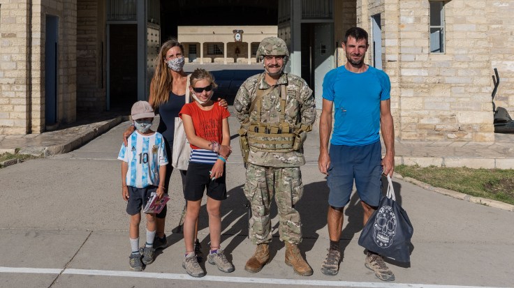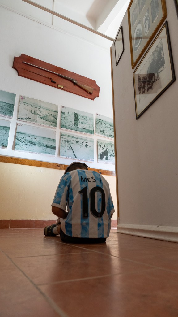 Il nous emmène à l’extérieur de la ville, au rond point puis…. devant la barrière de la base militaire. Il a contacté un responsable, fait des demandes et fait vérifier sa voiture pour nous emmener à l’intérieur. Alors, là, chapeau ! Et quelle chance! C’est ainsi que 4 français passent le contrôle, se garent avec Juanjo, et profitent d’une visite privée dans ces bâtiments de 1814, fierté du chef de la fanfare du site qui accueille 500 à 600 militaires chaque jour et tout premier bâtiment militaire en Argentine. Le musée nous révèle en autre les actions de ces unités sous l’égide des Casques Bleus des Nations Unies en Croatie notamment, des campagnes contre les Anglais en 1982, des entraînements sur l’Aconcagua et un Raphaël qui dessine une des armes en exposition.. Ouah, à nouveau! Puis, nous nous dirigeons derrière notre guide du jour dans le Patio numéro 1 avec l’histoire entre le Général San Martin combattant Napoléon Bonaparte en Espagne en 1808 et qui s’en inspirera pour les assauts à la trompette ou les uniformes… On est aux anges jusqu’à l’arrivée de la fanfare sur le balcon du 1er étage d’une aile du bâtiment. Là, on est aux larmes (enfin pour moi!) Et en rythme (pour Emma). La fanfare d’une vingtaine de personnes va jouer juste pour nous 4, plusieurs marches militaires. Incroyable non? Ça ne s’invente pas! C’est complètement dingue. Visite du second patio avec les différents véhicules militaires et c’est la fin. Nous sortons du bâtiment avant la session photographie avec notre guide. Une dernière rencontre, forte aussi celle-ci, le Commandant du régiment militaire, en personne. Nous entamons une discussion sur ses déplacements en France dans les Alpes notamment et le remercions de ce temps qu’ils nous ont tous octroyés aujourd’hui. C’est un honneur pour lui, nous dit-il! Mais c’est l’inverse. Quel honneur, quel plaisir, quelle joie de vivre cela ici. Merci à eux, merci à Juanjo d’avoir organisé tout cela.