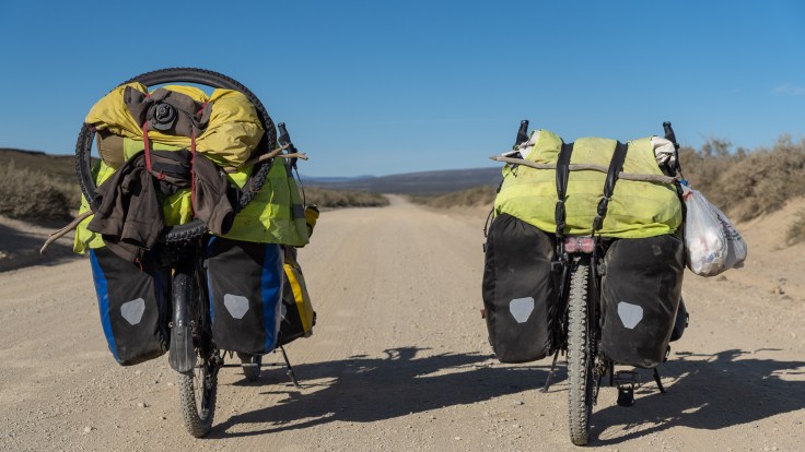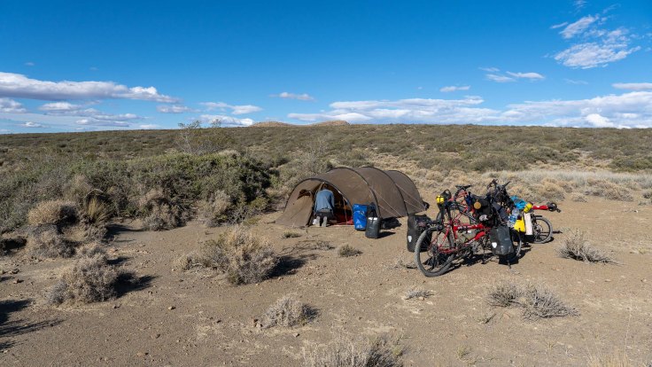 Sylvain avait dit que l’on s’arrêterait à 17h. Il est un peu tôt pour s’arrêter de pédaler mais la fatigue de la famille l’emporte. Des expéditions partent à 3 dans ces contrées, mais par deux fois, reviennent bredouilles: le terrain n’est pas plat, les buissons et piques sont légions (non merci pour les pneus et le dessous de la tente), le vent trop puissant. Il fera même vaciller nos vélos à l’arrêt pendant la recherche. Finalement, l’heure tourne, les pédaliers aussi, et nous ne trouverons un bivouac qu’à 16h55. 11km depuis notre déjeuner fini à 14h15… C’est dire la côte, les cailloux et leur instabilité ainsi que la beauté du coin.