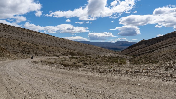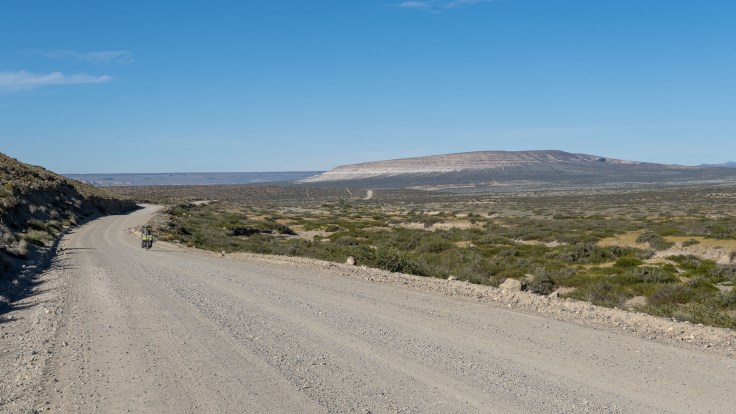 Alors, très tôt ce matin, nous pédalons! Enfin plus tôt que d’habitude, vu que l’on se couche tôt, il n’y a pas de miracle! La route est tranquille, asphaltée, le vent absent, peu de circulation, le soleil qui nous réchauffe, du plat faussement plat, des collines aux milles couleurs… et un chemin en terre à 9km de là. C’est l’entrée de l’ancienne ruta 40, qui longe la rivière.