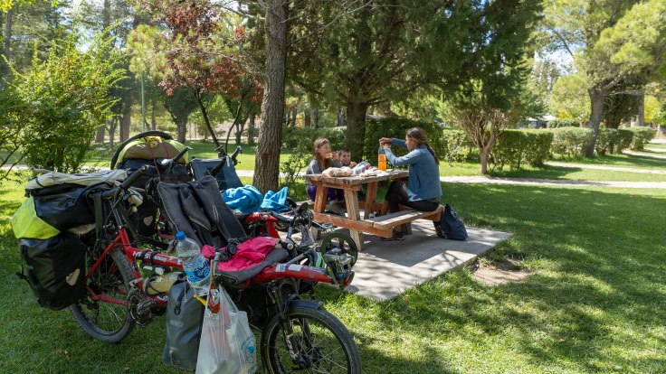Las Bajadas del Agrio, village avec beaucoup de verdures, d’arbres, de pelouses, de petites maisons en rez-de-chaussée, nous le traversons à la recherche d’un petit restaurant et d’une tienda avant sa fermeture (il est déjà 12h30…). Nous la trouvons sur le chemin principal, je file à l’intérieur avec Emma et dévalise pour ce soir, pour demain midi… et finalement pour ce midi puisque resto, il n’y a pas! La place principale, son herbe, ses jets d’eau, ses tables en bois et ses jeux d’enfants sont notre paradis du midi, surtout celui des enfants qui dévorent leur sandwich avant d’aller se défouler. Sylvain s’occupe plutôt de son rayon arrière encore une fois, au soleil. Un peu de chocolat Aguila (marque recommandée par Ana, la cyclo rencontrée en Bolivie à Tupiza au jour de l’an) et de pain, et nous quittons notre halte vers le Sud. Les policiers qui sont venus nous voir en plein repas pour nous demander nos passeports, nous ont recommandés le camping juste à côté, mais nous préférons avancer sur les 40km de ripio suivants avant le prochain village afin de limiter notre grosse journée demain.