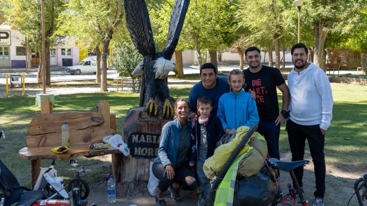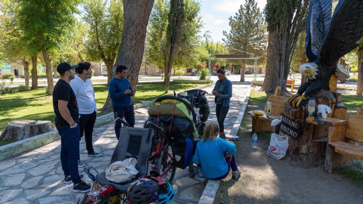Le final survient vers 12h30 lors du passage autour du rond point de Covunco Centro, en face de la base militaire du régiment de l’infanterie de montagne. Le village recherché pour notre déjeuner est à 1km de là, sur la droite. On y file jusqu’à la place principale à l’ombre de superbes arbres de 10m de haut. On y pique-nique avec une bonne tourte faite maison de la voisine du boucher, trouvé par Sylvain. Une aubaine pour nous avec nos restes de pique-nique sur les bancs de chaque côte de l’emblème du village: un aigle (ici en bois). A partir de ce moment, tout s’accélère. Nous rencontrons Jonathan avec qui nous discutons, qui nous prend en photo et qui avec Yvan (arriver après des coups de fil), va nous interviewer à tour de rôle (en espagnol bien sûr) en vidéo pour un réseau social ! JuanJo est là également, professeur de musique qui s’occupe également à la municipalité de la Culture. C’est une longue discussion, du partage qui s’engage… pour nous faire rester ici. Il y a un camping (gratuit) avec douche chaude, de l’herbe, c’est un village tranquille. Foi de tous les trois: on y sera bien. Seulement, nous avons des impératifs administratifs : Neuquen et la migration… « No te preocupe! » C’est un peu ça. JuanJo se propose d’emmener Sylvain à Zapala en voiture pour aller prendre un bus pour Neuquen à 200km de là pour faire les démarches. Le problème est réglé! La migration n’étant ouverte que le matin, c’est très tôt qu’il convient d’un rdv pour demain. Ayant à cœur que nous nous sentions bien dans leur village, chacun se propose de nous aider si nous n’avons pas suffisamment de bonnes connexions internet en venant chez eux ou à leur travail. On reste sur le cul face à autant de bienveillance. Juanjo nous fixe un rendez- vous cet après-midi à 16h15 pour aller visiter sa ville en voiture. Vous y croyez vous?