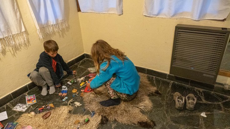 Villa La Angostura est un petite ville aux magasins en bois, aux maisons en rez-de-chaussée en bois également et donne un air de village des Alpes traditionnel. Pedro et Susana, un couple de septuagénaire, sont là pour ouvrir leur portail de toutes les couleurs et nous font visiter un grand garage, auparavant loué par le centre culturel, qui était avant utilisé par eux-mêmes comme maison d’habitation. Ils l’ont récupéré, réparé et nettoyé. Cela fait une maison indépendante dans leur jardin, chacun gardant son intimité. Chauffé pour nous, il comprend une salle de bain, une cuisine avec un four (s’il vous plaît!!) et d’une chambre avec 2 lits. Ils ont prévu des planches pour nous pour faire un sommier, s’excusant de ne pas avoir d’autres lits. C’est à nous de s’excuser de les déranger. C’est énorme ce qu’ils nous proposent, un toit, un cocon chaleureux, chaud, une douche chaude. C’est extraordinaire, encore une leçon d’hospitalité!