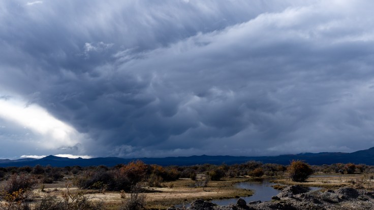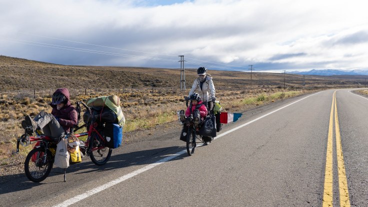 A 11h, nous retraversons la ville plein Sud, avec l’aide du vent, on est soulagé. Le ciel est bleu, on ne s’inquiète pas de ce côté là, il est prévu pour toute la journée. Ce sont juste les températures qui nous titillent: 6 degrés ce matin, 1 de plus au plus chaud de la journée, et une chute brutale des températures est encore prévue sur les 3 prochains jours. Et avec le vent, vaut mieux être prudent lorsque l’on s’arrête. Alors, nous pédalons tranquillement parmi la même pampa qu’hier, pendant 1h, on profite du paysage dans les tons gris. Le jaune de l’automne a déjà disparu après 3 semaines de vie. Les buissons sont partout dans les champs et sur les collines. On photographie, on profite, on regarde le début de l’arc en ciel sur notre droite… Bizarre car il fait beau??? Très bizarre maintenant car cet arc-en-ciel est complet. Sylvain l’enregistre sur son appareil photo… et là, on comprend. Un nuage de pluie fonce sur nous, fonce sur la pampa, recouvre tout et efface le panorama au fur et à mesure de son avancée. On pédale pour y échapper, le vent nous pousse, ça devrait passer. Et bien non, car le nuage de pluie/ neige est également poussé par ce même vent et il va plus vite que nous. Stop, on met le poncho et les pantalons de pluie pour tous, même les parents mais avec le vent, c’est dangereux, le ponchon est à l’horizontal et difficile à enfiler. La sacoche ouverte avec les affaires de pluie se fait tremper (avec le papier toilettes dedans), les poches poubelles pour les pieds n’y sont pas. Je m’énerve car je ne trouve pas pour protéger les pieds de tout le monde, et on se fait tremper, et on a froid et j’oublie où sont mes gants. Alors, je crie en furie et balance tout pour repartir, tant pis pour mes pieds et mes mains. Je pédale de colère et avance mouillée. Raphaël et Emma s’assoient et recroquevillent leurs jambes sous le poncho. Mon énervement s’estompe à mesure que mes doigts gèlent. Le vent les glace avec la pluie dessus. On fait une pause de nouveau pour chercher mes gants dans la sacoche grise au fond et enfiler aussi des poches poubelles au pied. Je m’excuse de ce moment. Et on s’active de concert à bon rythme. Le ciel bleu n’est pas loin mais il recule à chaque coup de pédale. Arghhhh. On garde le moral. Les enfants n’ont pas froid, c’est bien le principal. Et puis la pluie s’atténue, ne se fait plus que par bribes, puis s’évapore avec son nuage gris. Ça y est, c’est fini.