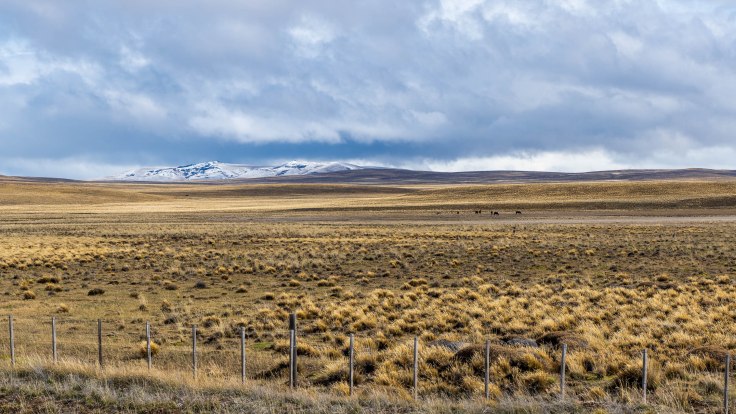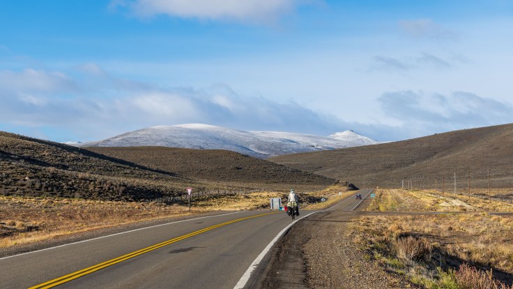 La route nous attend, ou est-ce nous qui sommes impatients? On le sait, les prochaines portions sont isolées, venteuses, sans lacs mais on y trouve toujours quelque chose de beau à contempler. Alors, on a hâte de pédaler dans la pampa, parmi les champs, les herbes, entre les collines qui aujourd’hui sont toutes recouvertes de neige 200 ou 300m au-dessus de nous. La ligne de démarcation est bien visible et rend sublime ce saupoudrage! Nous sortons du village et sentons déjà l’isolement, l’éloignement de toute forme de civilisation. Les voitures se font rares, très rares. Une moto est garée sur le côté. Je m’arrête à leur hauteur pour savoir si tout va bien. Ils ont froid et devaient aller à Ushuaia. Ce sera pour plus tard, disent-ils, en été. Oups. En attendant, je leur précise qu’une station service à qqes km offre de l’eau chaude et à une salle à disposition… qu’ils aillent plutôt là-bas plutôt que le bord de la route. On se quitte. SUERTE.