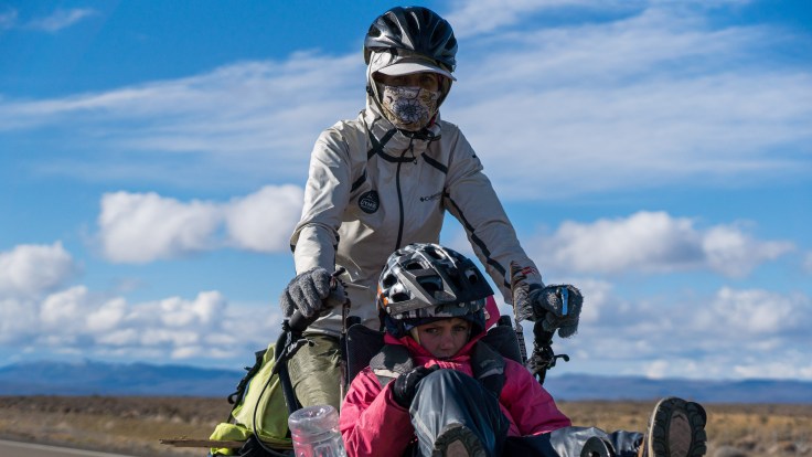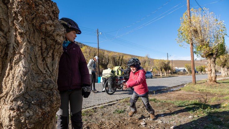 Le soleil réapparaît, avec toujours ce vent terrible et cette température de 7 degrés (c’est la température sous abri, mais je vous assure que la température ressentie est bien inférieure avec ce vent) ! Pour se remettre de ce petit épisode sympathique de la Patagonie, les vélos se mettent au soleil, sur une aire sur le bas côté, se font décharger d’un tarp rouge et de quelques victuailles pour un pique-nique, derrière quelques arbres, à l’abri. 13h, lorsque nous acceptons cette pause pour sécher les gants, les fesses (pour les adultes) qui se sont faites tremper avant d’avoir pu être protégées par les pantalons de pluie (celui jaune fluo et le vert des pêcheurs: on a des touches!!!). On le sait, ce n’est plus le même temps pour déjeuner, car ici, on risque trop de se refroidir, de geler nos membres à découverts. Nous avons tout de même parcouru 20km en 2h. Honnêtement on pensait aller plus vite avec ce vent de dos, un peu comme hier. Mais, cela ne fonctionne pas aujourd’hui.