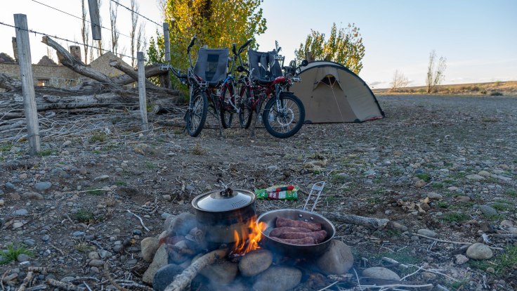 On y est arrivés à notre bivouac, épuisés mais heureux. La maison abandonnée est une propriété privée où l’on n’a pas voulu entrer. Elle n’a plus de toit, mais les murs toujours debout auraient pu nous fournir un bon abri pour les vents toujours présents. Mais comme un panneau indique « propriété privée, ne pas entrer », on a préfère rester du bon côté de la barrière, protégés d’un tas de bois et de quelques arbres encore debout. On monte la tente, et à 18h, Sylvain a pu faire du feu pendant que je finissais d’installer l’intérieur. Ce soir, c’est barbecue et festin. Les pâtes sont à Sylvain, ce que le riz après les 4 mois de Pérou et 1 mois de Bolivie est à moi: overdose indigeste. Pour faire un voyage comme le nôtre, il faut accepter une bonne dose d’inconfort, et manger des pâtes à l’eau durant des semaines, des mois, quasi tous les soirs, en fait partie. On acceptait bien jusqu’alors ces petits désagréments. Mais on arrive à un stade où on sature totalement sur certains sujets. Pour Sylvain, les pâtes à l’eau tous les soirs, ça ne passe plus… Alors, surprise, ce soir c’est purée et saucisses! Mais de vraies bonnes saucisses de chez le boucher. Histoire de redonner du goût à mon chéri. On mange tôt mais on a faim et froid, on a envie de se mettre sous la tente rapidement avant d’avoir des picotements généralisés dans tout le corps (comme sur les joues et doigts!!). Nous dînons sous l’abside, pendant que de l’eau chaude chauffe sur le barbecue (quelques pierres assemblées en ring). C’est thé pour tous les 2 ce soir. Sylvain fait une entorse à son café, un vrai sacrilège dirait ses amis! Mais, il faut ce qu’il faut pour remettre nos ventres dans le droit chemin.