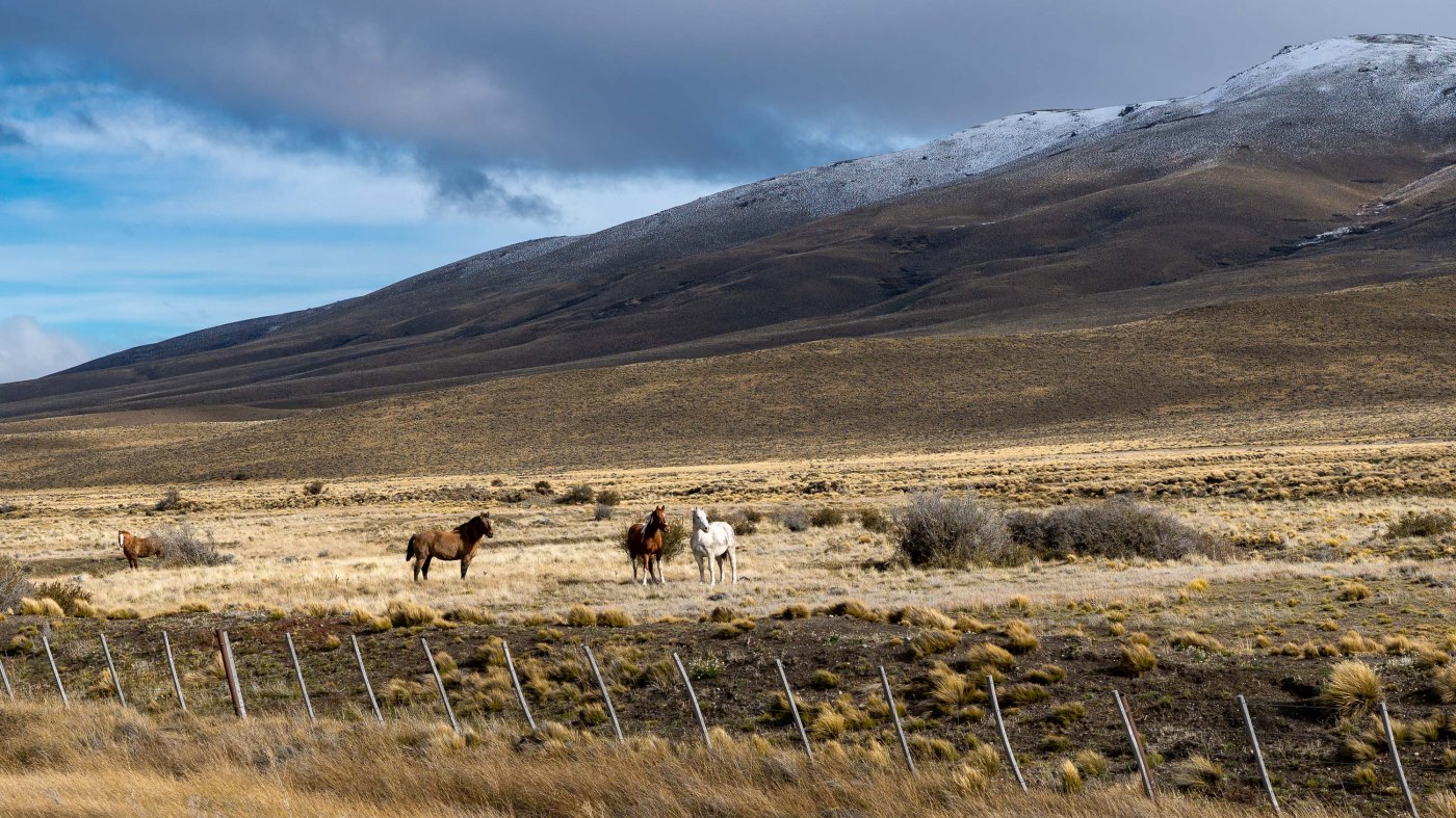 La route nous attend, ou est-ce nous qui sommes impatients? On le sait, les prochaines portions sont isolées, venteuses, sans lacs mais on y trouve toujours quelque chose de beau à contempler. Alors, on a hâte de pédaler dans la pampa, parmi les champs, les herbes, entre les collines qui aujourd’hui sont toutes recouvertes de neige 200 ou 300m au-dessus de nous. La ligne de démarcation est bien visible et rend sublime ce saupoudrage! Nous sortons du village et sentons déjà l’isolement, l’éloignement de toute forme de civilisation. Les voitures se font rares, très rares. Une moto est garée sur le côté. Je m’arrête à leur hauteur pour savoir si tout va bien. Ils ont froid et devaient aller à Ushuaia. Ce sera pour plus tard, disent-ils, en été. Oups. En attendant, je leur précise qu’une station service à qqes km offre de l’eau chaude et à une salle à disposition… qu’ils aillent plutôt là-bas plutôt que le bord de la route. On se quitte. SUERTE.