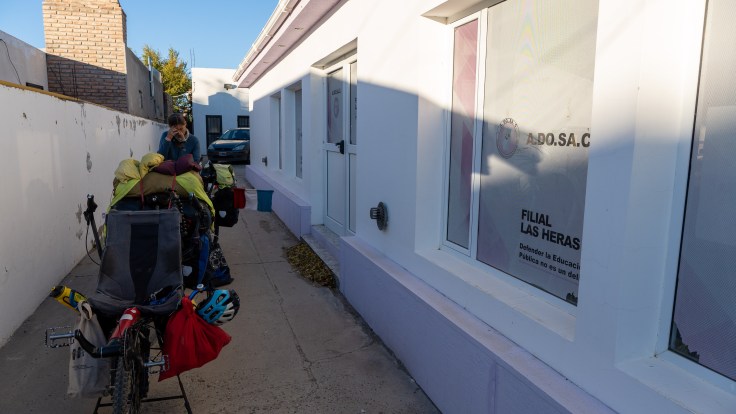 Toute la nuit, le vent a soufflé et fait du bruit dans les toitures du bâtiment, fait bougé les arbres tout autour. Cela souffle encore énormément ce matin, au point que Claudio et Bibiana nous envoient des messages pour nous demander de rester une journée de plus ici. Effectivement, c’est alerte avec des vents à plus de 110km/h à 7h. On prend donc notre temps pour petit-déjeuner dans la salle de réunion, non pas parce que nous restons aujourd’hui mais parce que nous attendons que le vent faiblisse. Et il le fait, vers 10h, pile quand tout est ordonné dans les sacoches, tout remis à sa place dans les locaux. Alors nous prévenons Bibiana pour les au-revoir et elle nous retrouve devant le bâtiment avec Nala, son chien! C’est dur, encore une fois, pour moi et pour elle. Alors, on commence la route avec elle devant dans sa voiture, dans les rues de Las Heras que nous visitons de nouveau, jusqu’au rond-point à la sortie de la ville. C’est ici que nos chemins se séparent, non sans être poignants. La route nous appelle une nouvelle fois et nous apercevons Bibiana près des lettres vertes de la ville dans nos rétroviseurs vers 10h40.
