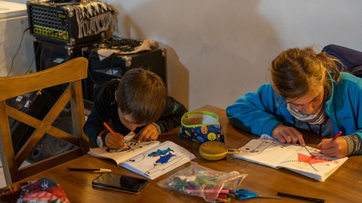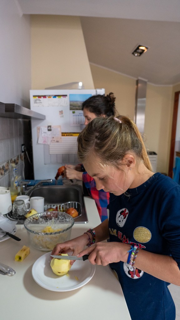 Pendant que Beto et Sylvain partent chercher une fenêtre tout l’après-midi, les enfants jouent. Raphaël regarde des documentaire et Emma cuisine une tarte aux pommes avec Mirna. Une partie de la pièce à vivre m’est interdite… Surprise ! Pendant que j’avance sur le blog et que je discute avec eux en buvant thé sur thé, les garçons reviennent. Les enfants sont soulagés car il commence à faire nuit et que ce ne sera plus l’heure de souffler les bougies et d’ouvrir les cadeaux! Encore un moment de partage que ce groupe damis nous octroyent autour du goûter.