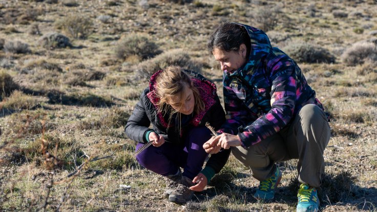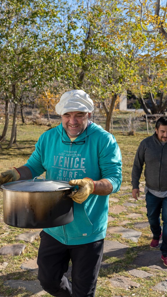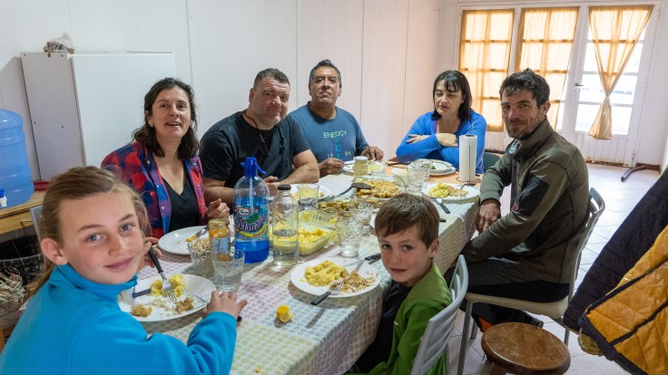 Aujourdhui, c’est immersion dans la vie de Chule et Mirna, dans l’estancia de leur famille, d’origine écossaise. Ils nous y emmènent en voiture sur 60km dont 40 de ripio pour accéder à la propriété « sin nombre ». Javier, qui travaille et vit seul dans cette estancia, à une heure de la ville, a tué et préparé un agneau du troupeau en notre honneur, qui cuit dans une grosse marmite sur le barbecue jusqu’à 13h30. Chacun vaque a son loisir: partage de maté, jeux d’échecs, jeux de ballon, photos, recherche de pointes ou flèches d’indigènes dans le terrain de 2 500 hectares datant de 300 ans environ.