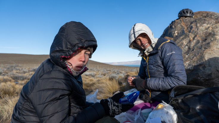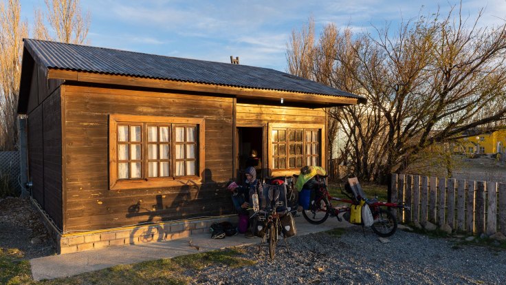 Ce que le vent a soufflé cette nuit, faisant bouger les plaques de notre cabane au-dessus de nous ainsi que la poche poubelle mise sur le siège d’un des vélos (en cas de pluie et givre). A 8h, lors de notre lever, le vent souffle toujours et nous questionne sur la journée à venir. Quelle force a t il? Faut il aller pédaler malgré cette force venant de l’ouest, face à nous? Si il est trop fort, nous ne pourrons avancer. Chacun notre tour, nous sortons pour évaluer comme on peut. Le météorologue de la famille vérifie de nouveau les prévisions sur internet: pas de rafales prévues, 20 à 30km/h pour aujourd’hui. On décide de ranger tranquillement nos affaires et de faire le point au lever de soleil vers 9h30. C’est ainsi que nous petit-déjeunons au chaud du pain grillé à la poêle, que les enfants prennent énormément de temps pour cela sans s’inquiéter le moins du monde, que nous rangeons et nettoyons tout, que les sacoches sont bien remplies lorsque le vent faiblit. Ouf, c’est une bonne chose. Nous allons pouvoir partir sur 3 jours pour aller vers El Chalten à 130km d’ici. Les prévisions sont bonnes: il va faire très froid mais pas de pluie ou de neige à l’horizon des prochains jours, vent modéré à 25/30km/h. La fenêtre est là, on va en profiter. Merci à notre Monsieur Météorologue!!