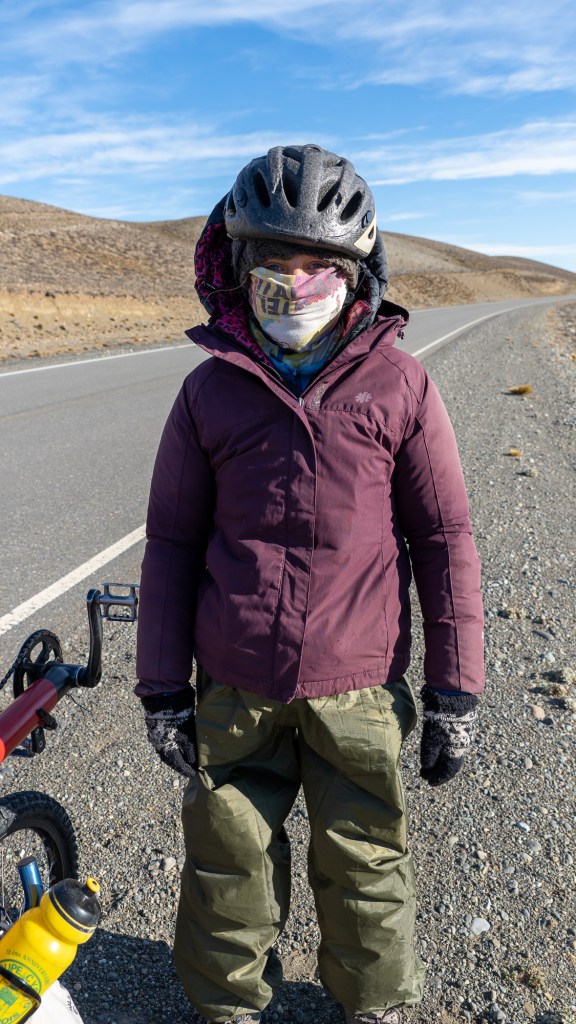 Vers 10h, nous quittons notre cabaña en bois, les enfants emmitouflés avec tous leurs vêtements, agrémentés en dernière couche du pantalon de pluie, histoire de faire écran. Nous traversons le village endormi en ce jour férié d’indépendance du pays, personne en vue. Dès le panneau de sortie: « Buen Viaje », on se retrouve dans le désert et on sent que l’on va pédaler fortement tout le jour. Pas de surprise, le vent est bien là, face à nous, comme le soleil. Mais les températures restent négatives encore. C’est le mental qui nous guide, qui conditionne notre allure, notre envie d’aller voir ce Fitz Roy. On est tous très motivés, même si cette portion ne sera encore pas évidente. Ce n’est que 3 jours!